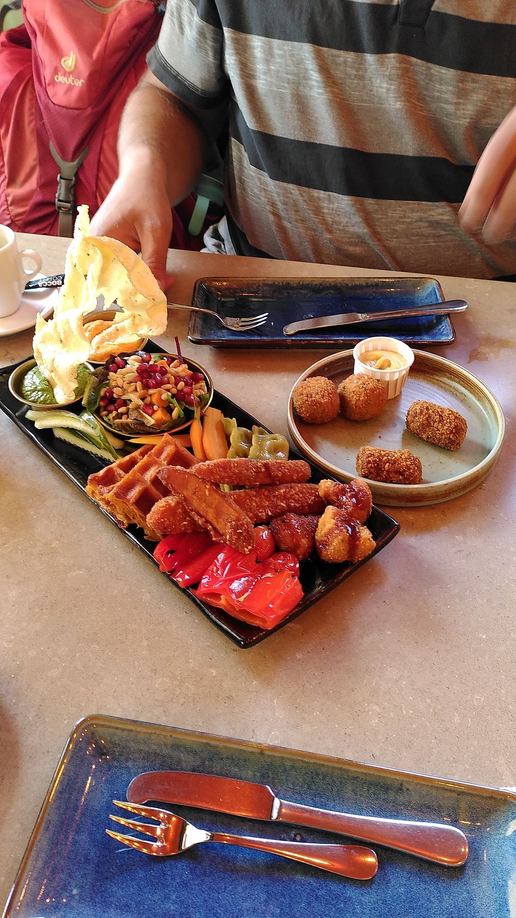 Vegane Optionen sind klar gekennzeichnet. Es waren circa 7 große und kleine Gerichte. Vegane Majo ❤️Hafermilch für Kaffeespezialitäten vorhanden.