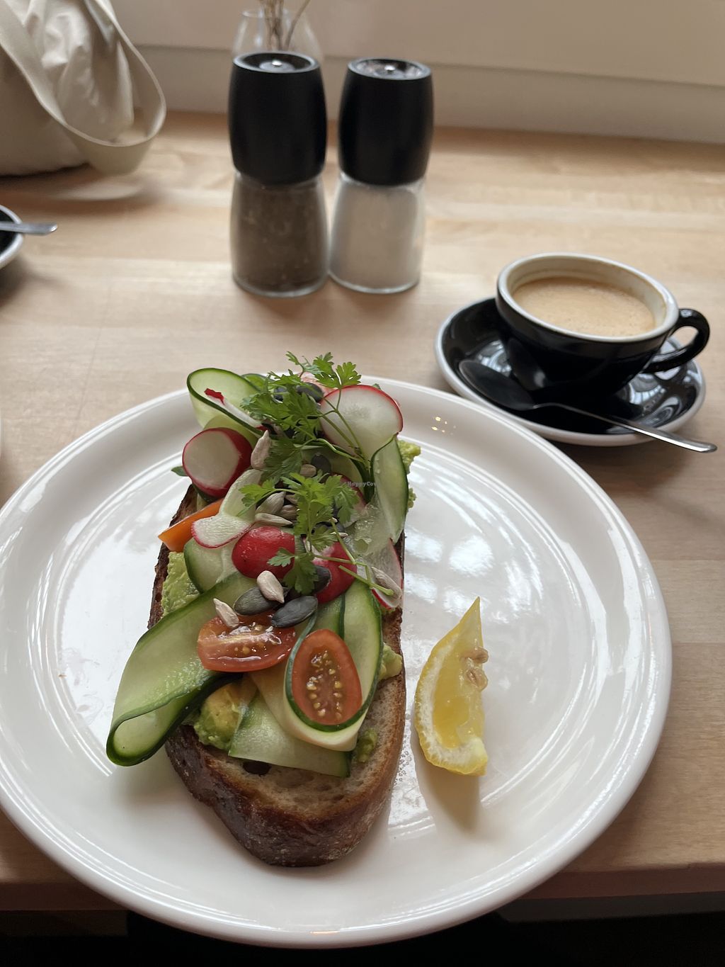 Modern open space cafe with vegan options and several kinds of plant milks. The vegan avocado sourdough bread was tasty. Most drinks can be ordered hot or iced. Whereas it was delicious, it was a bit on the pricier side. Just to have an idea: the matcha latte was 6,90 EUR, the bread was 14,90 EUR.