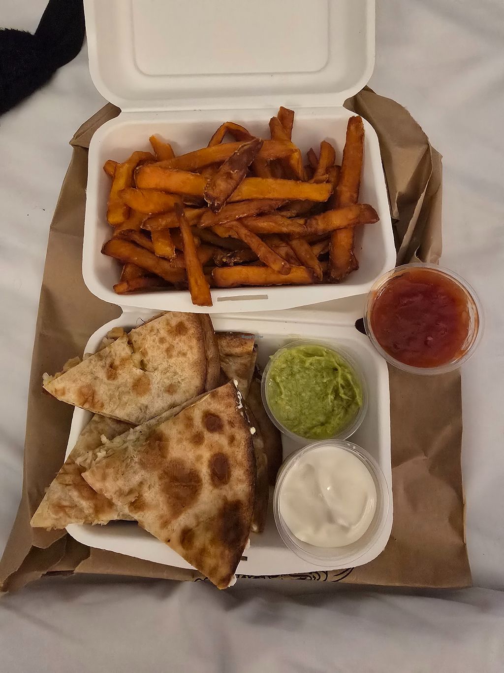 Read moreI ordered the quesadilla Heura with sweet potato fries but they had a few other options too. I absolutely love Heura products and was very excited to see it on the menu. It came with a range of vegan dips too and the guacamole was amazing especially for a fast-food place. It was incredibly tasty, but the fries were a little cold but I still thoroughly enjoyed them.