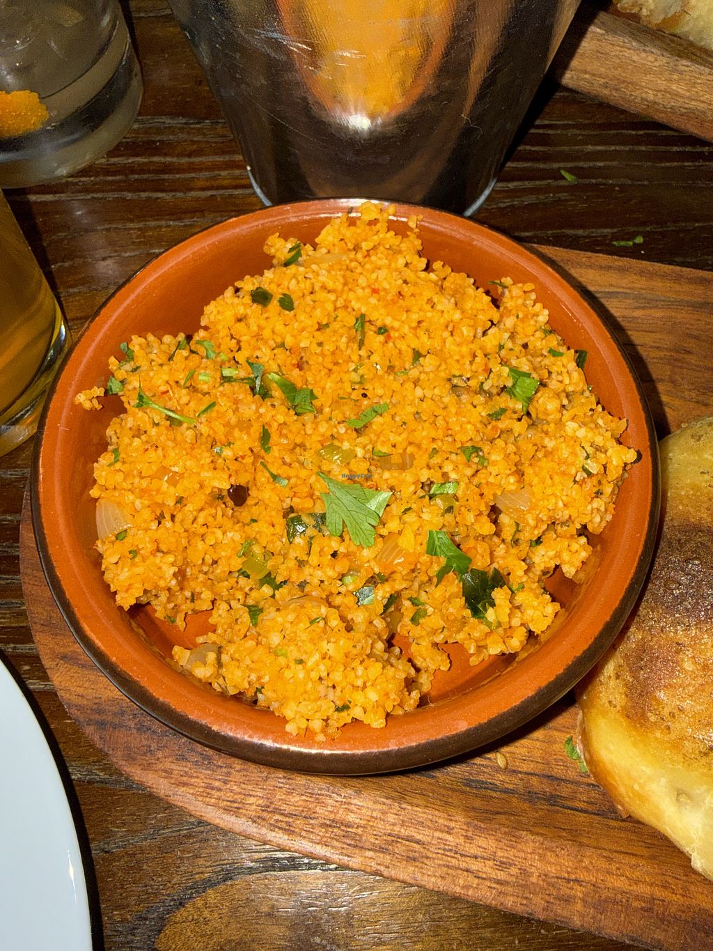 Non-veg Serves meat, vegan options available. Turkish restaurant with several vegan options., falafel platter, falafel pita sandwich, hummus, tabouli, red lentil soup, butternut squash soup, fries Open Wed 5:00am-9:00am, Thu-Sun 5:00pm-9:00pm. More