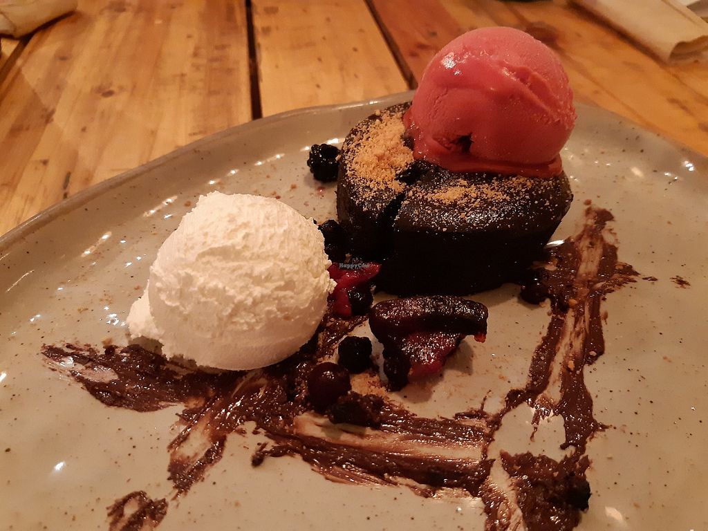 Vegan Brownie with ice-cream and choc sauce