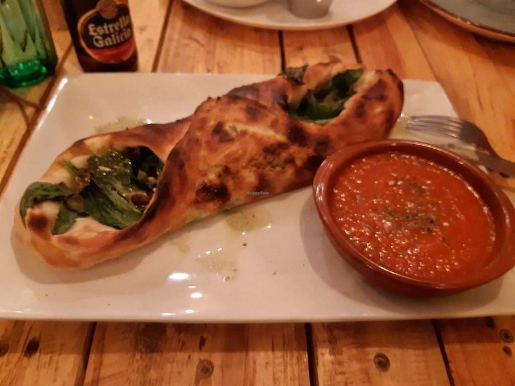 Calzone relleno de espinacas, queso vegan y pasas.