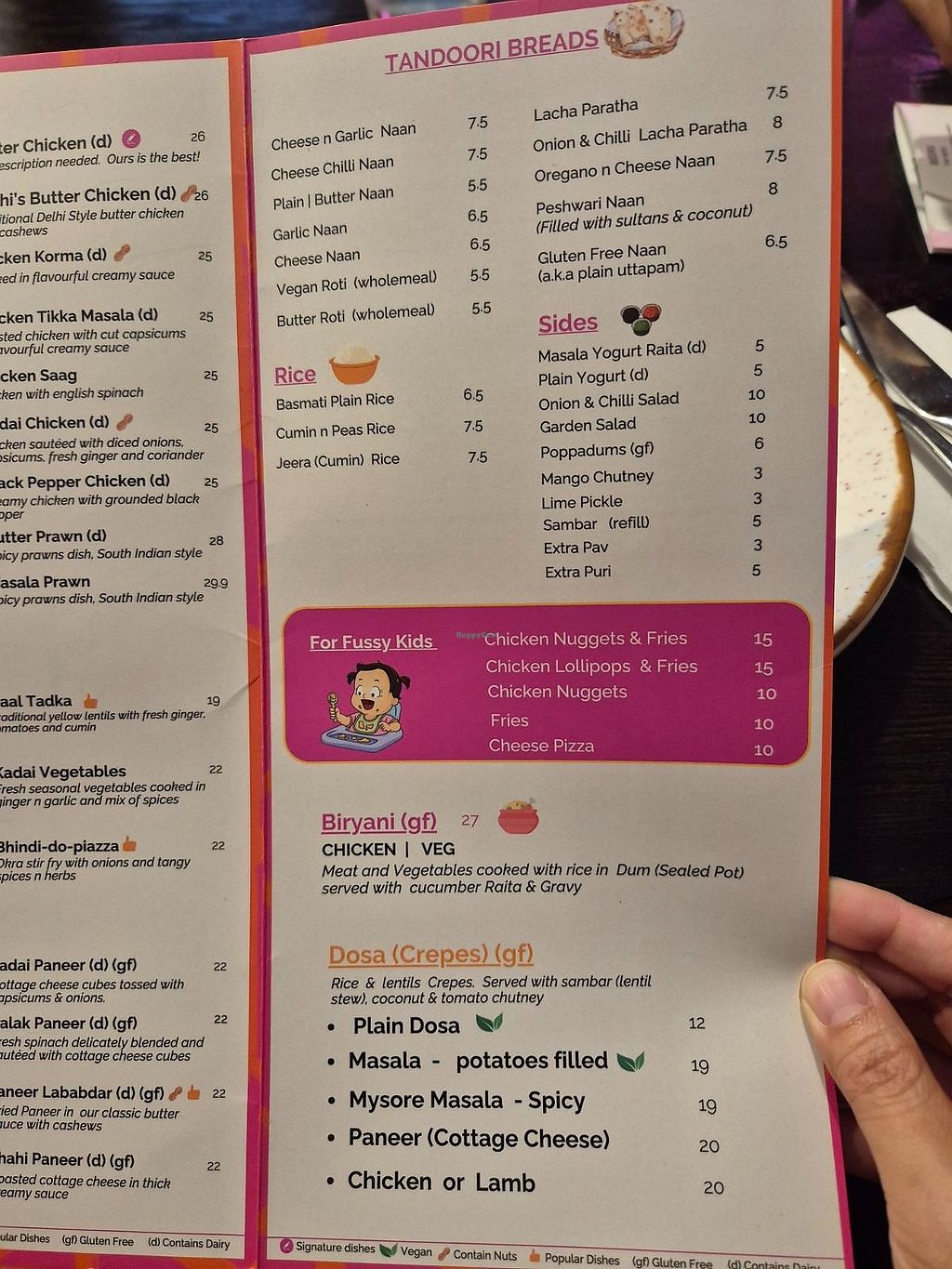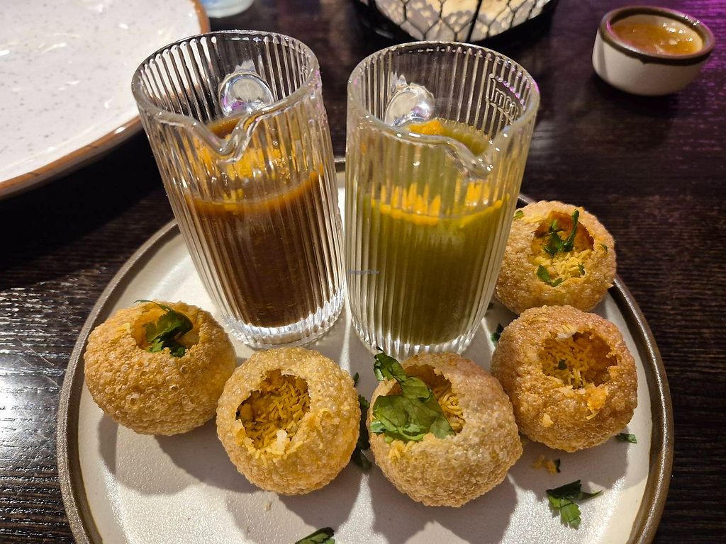Serves meat, vegan options available. Restaurant offering clearly labelled vegan dishes, including vegan butter chicken, pani puri (vegan filling), and vegan dumplings/potstickers. Vegan lunch thali available with mixed curries, rice, naan, salad, pickle, poppadum, and dessert. Open Tue-Thu 5:00pm-10:00pm, Fri-Sun 11:00am-10:00pm. Closed Mon.