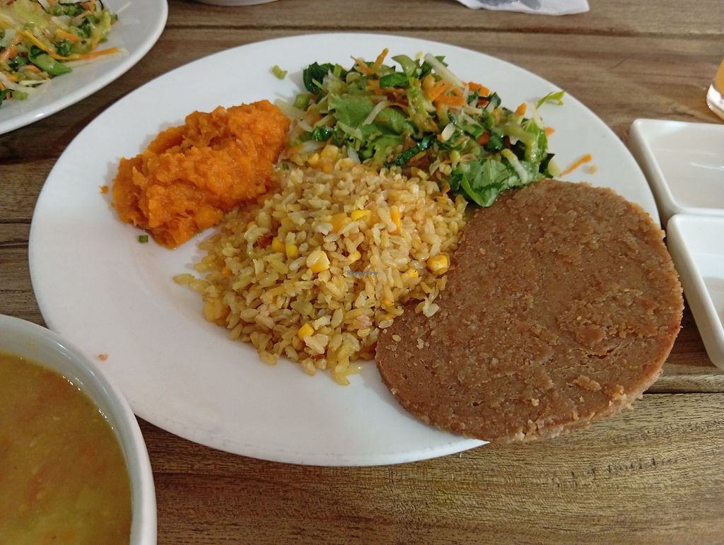Deliciosa la bandeja: Arroz integral con maíz, puré de ahuyama, filete…