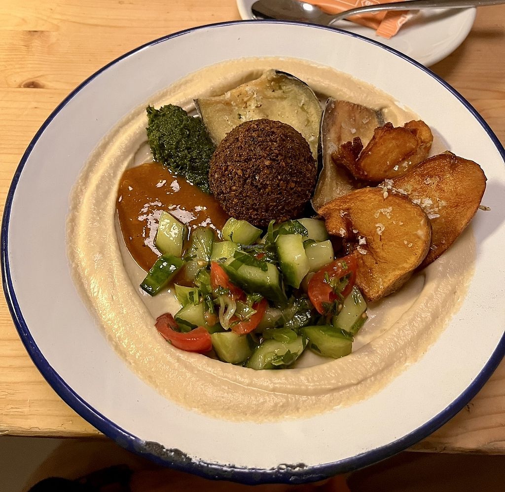 Hummus chili sin carne, hummus with mushrooms, roasted cauliflower, eg…