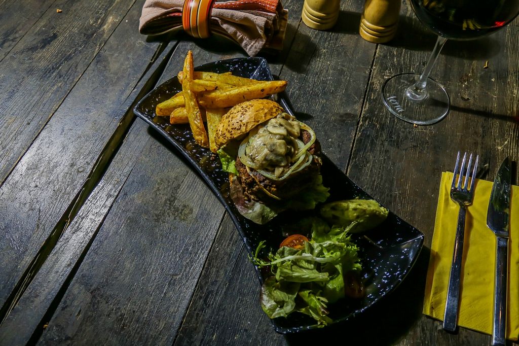 vegan burger with mushroom sauce