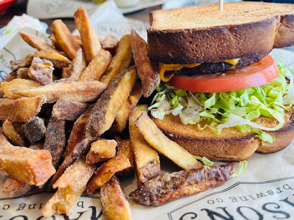 Serves meat, vegan options available. Brewpub offering vegan choices such as a local veggie burger patty, which can be made vegan by ordering it on toast. Also serves fried teriyaki tofu with pickled carrots. Guests can inquire about potential cross-contamination. Open Mon-Tue 11:00am-9:00pm, Wed 11:00am-9:00am, Thu-Sun 11:00am-9:00pm. Closed Tue.