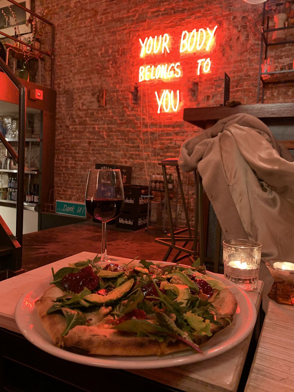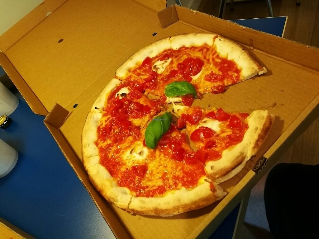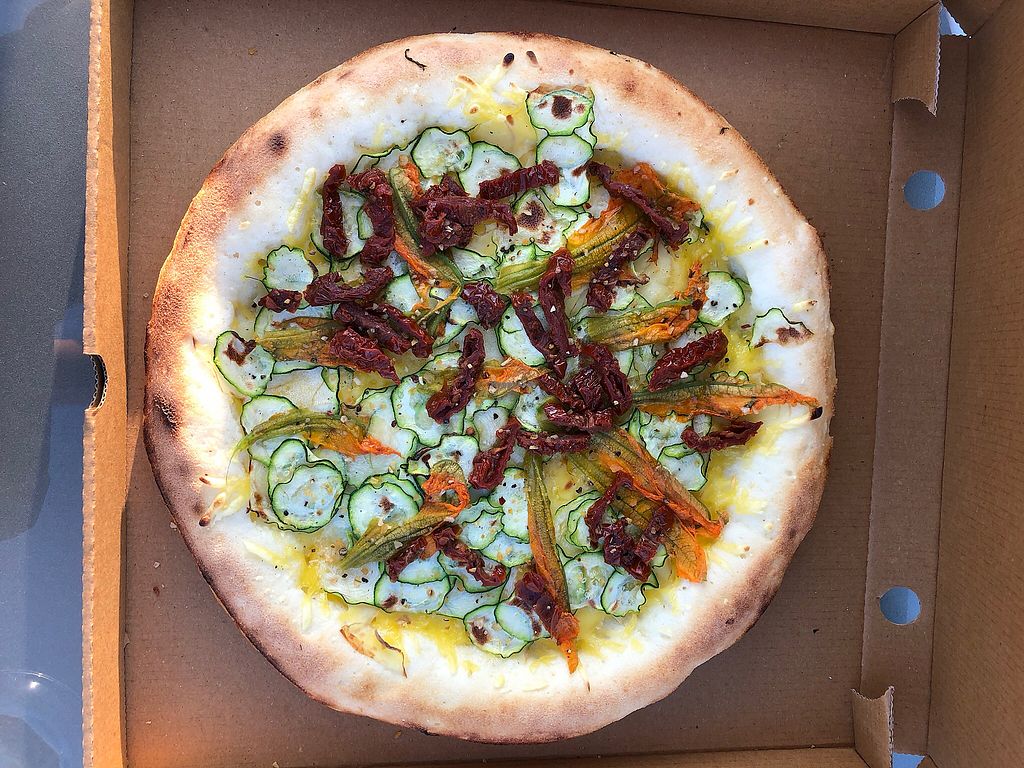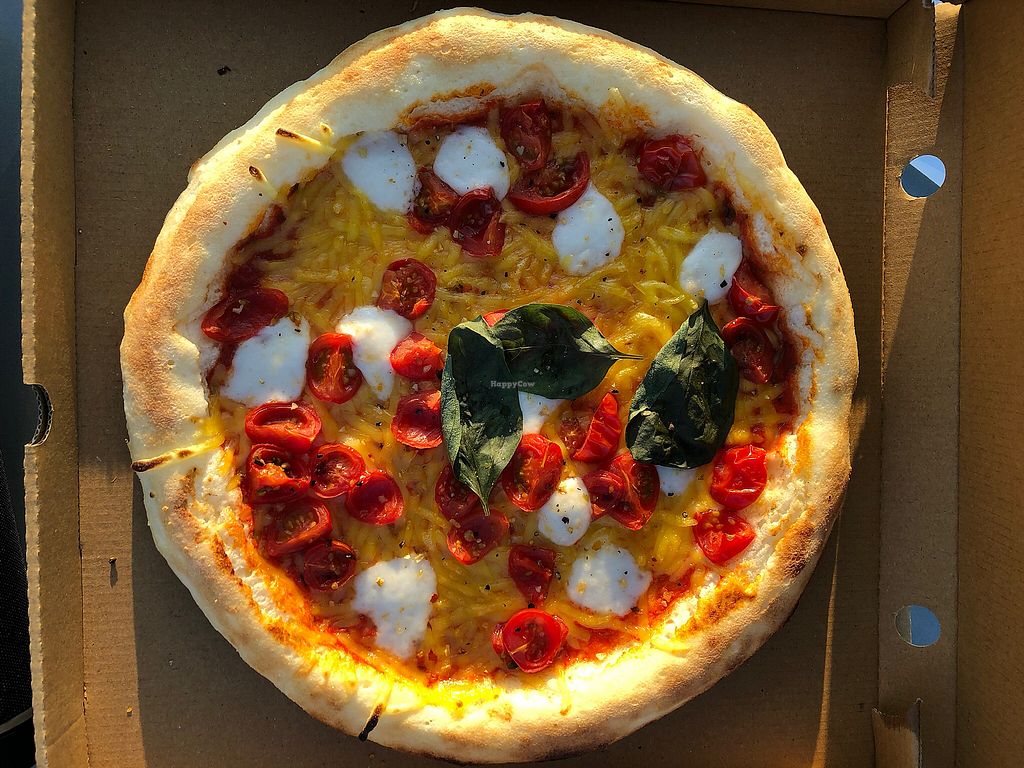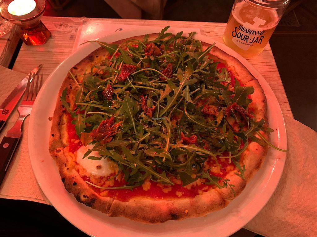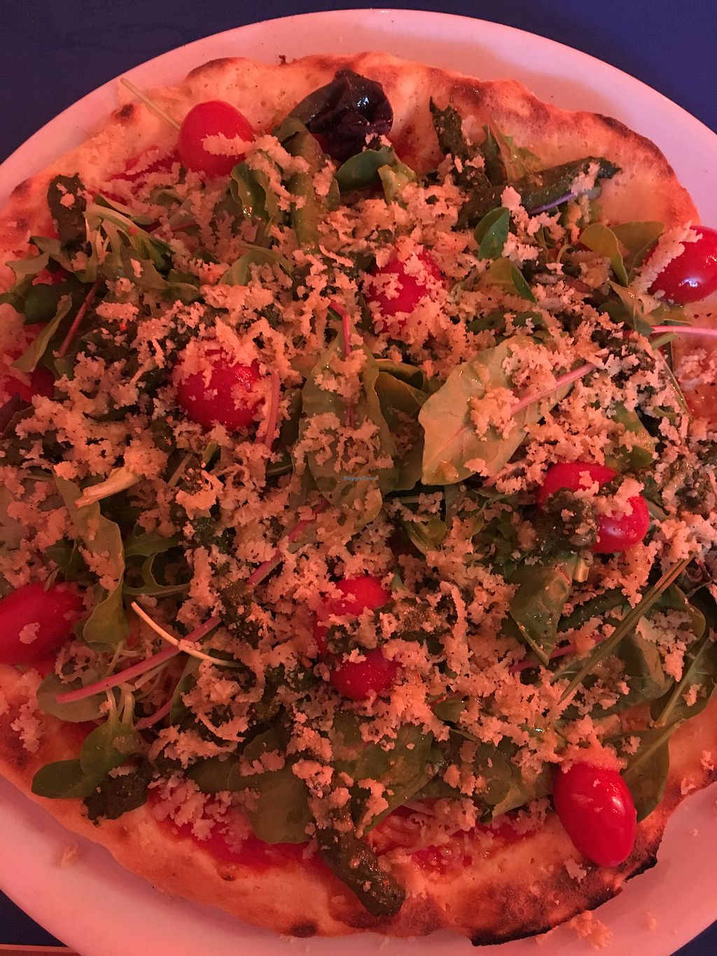 Tomato, rocket salad, pesto, and vegan Parmesan cheese pizza