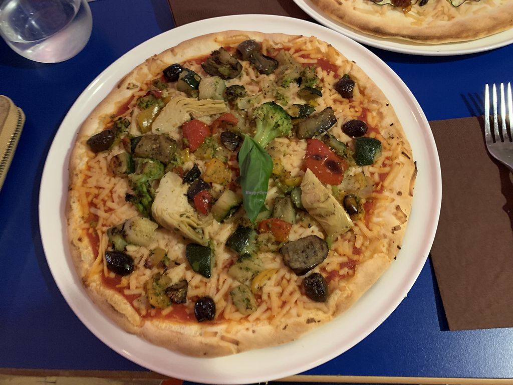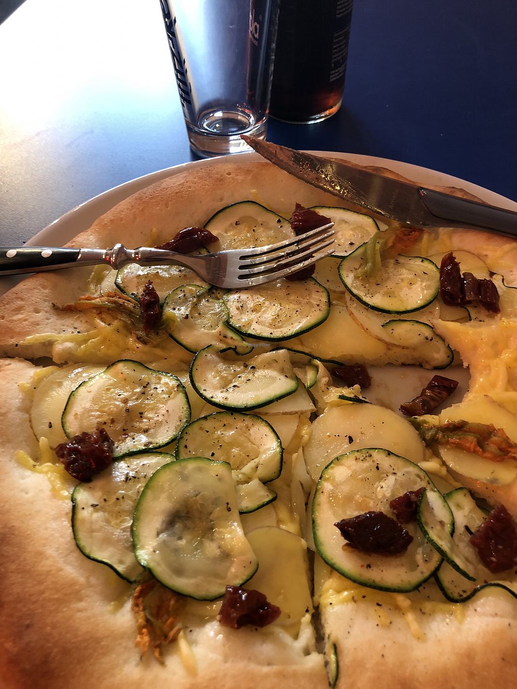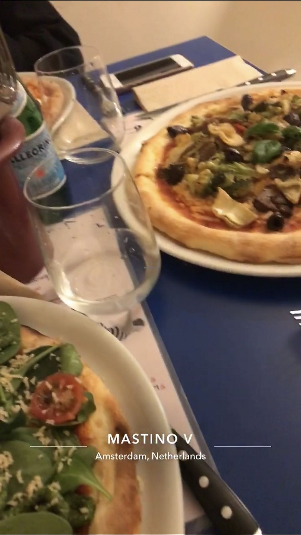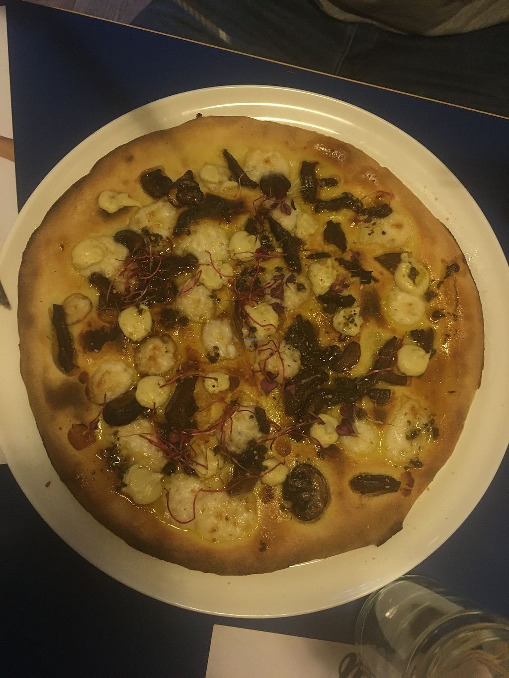 Tomato, rocket salad, pesto, and vegan Parmesan cheese pizza