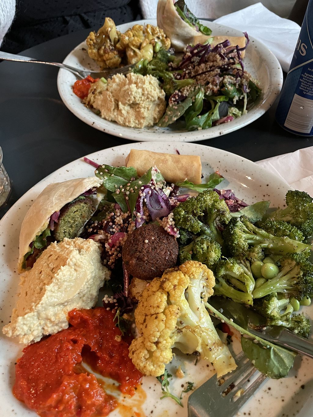 Nice vegan restaurant on the beautiful umbrella lined street. We didn’t have time for a buffet, so we ordered the falafel wrap to-go and it was delicious. We describe it as a bougie falafel wrap! So good. 💚