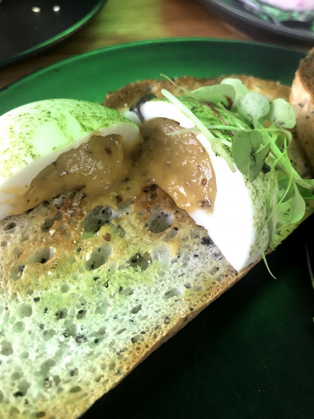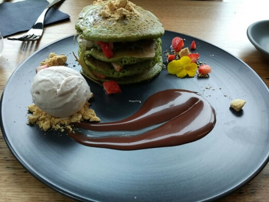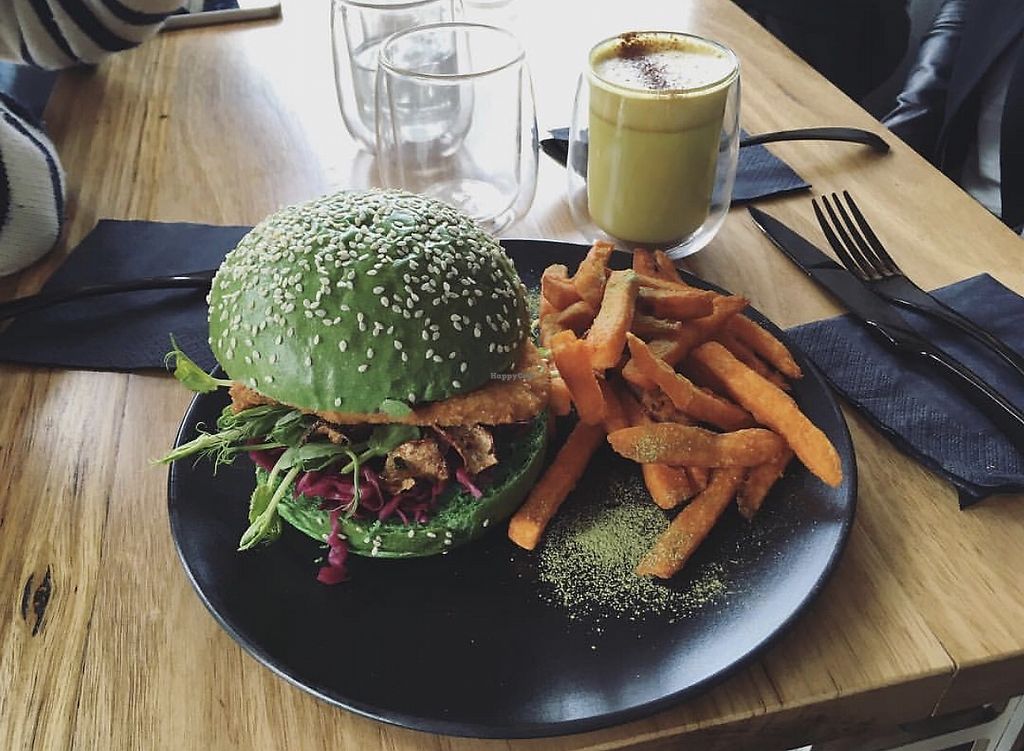 Cafe specialising in using matcha. Offers an array of savoury & sweet food items and latte drinks. Example of choices include vegan egg hollandaise, vegan egg toast, matcha burger, avo toast, acai bowl, cold pressed juices, and pancakes. Food is colorful and well-presented. Reported closed June 2022.
