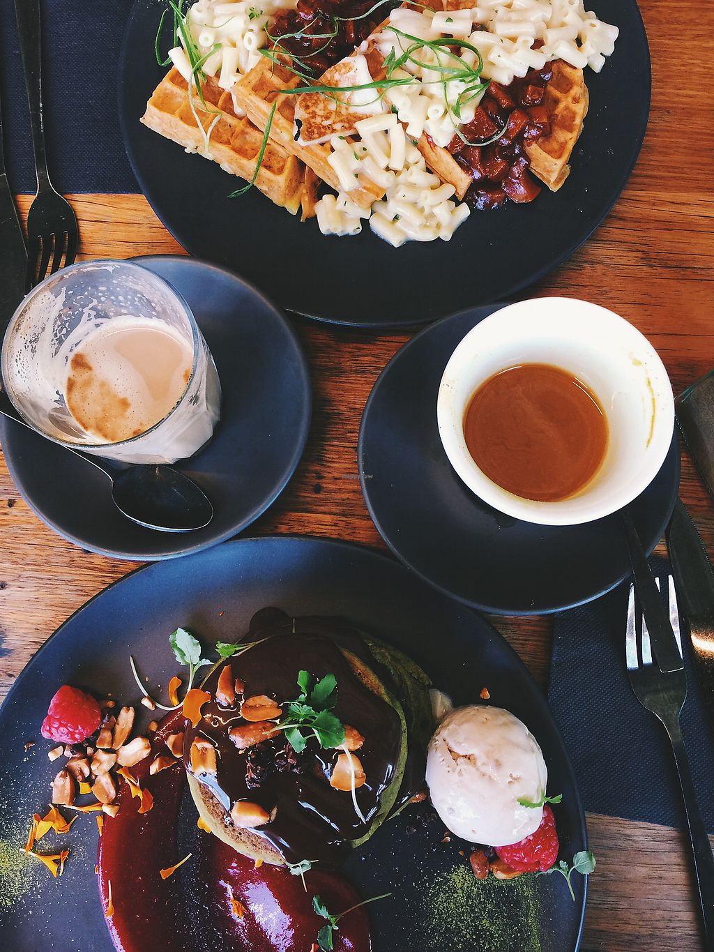 Some clever items like the vegan eggs. Hollandaise vegan eggs are tasty and the mac and cheese. Highly recommend the mock Popcorn Chicken Tray. Best dish I've had there. Brekkie is good but mac and cheese doesn't match with it so swap it out. Latte flight sampler is yum - especially Apple pie latte, purple latte and smurf latte.