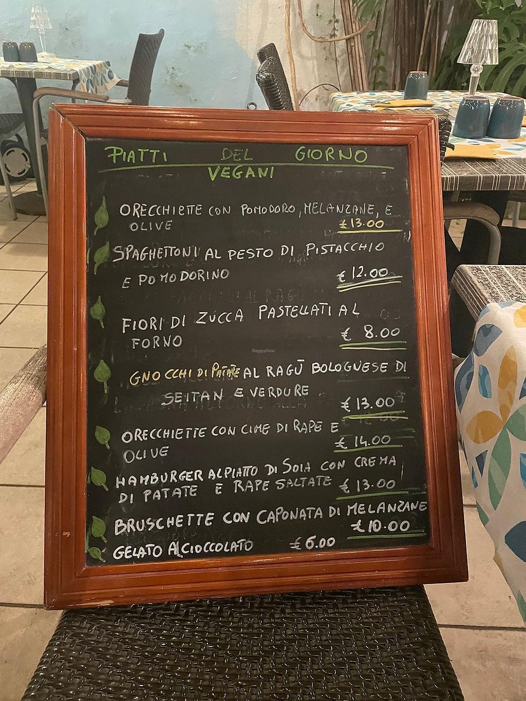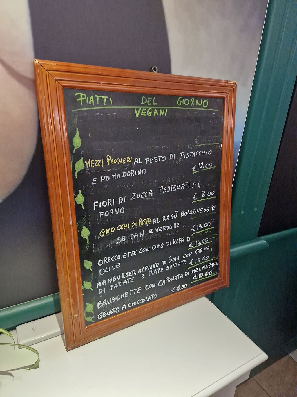 What a lovely restaurant. Full vegan menu. Amazing food. Very reasonably priced. An absolute must - you won’t be disappointed. We had the bruschetta and the zucchini flowers to start and I had the pistachio pesto spaghetti for main. I was in food heaven!!! My husband had a main course too. Plus a bottle of wine, bottle of water and a large beer. The bill came to about €70.
