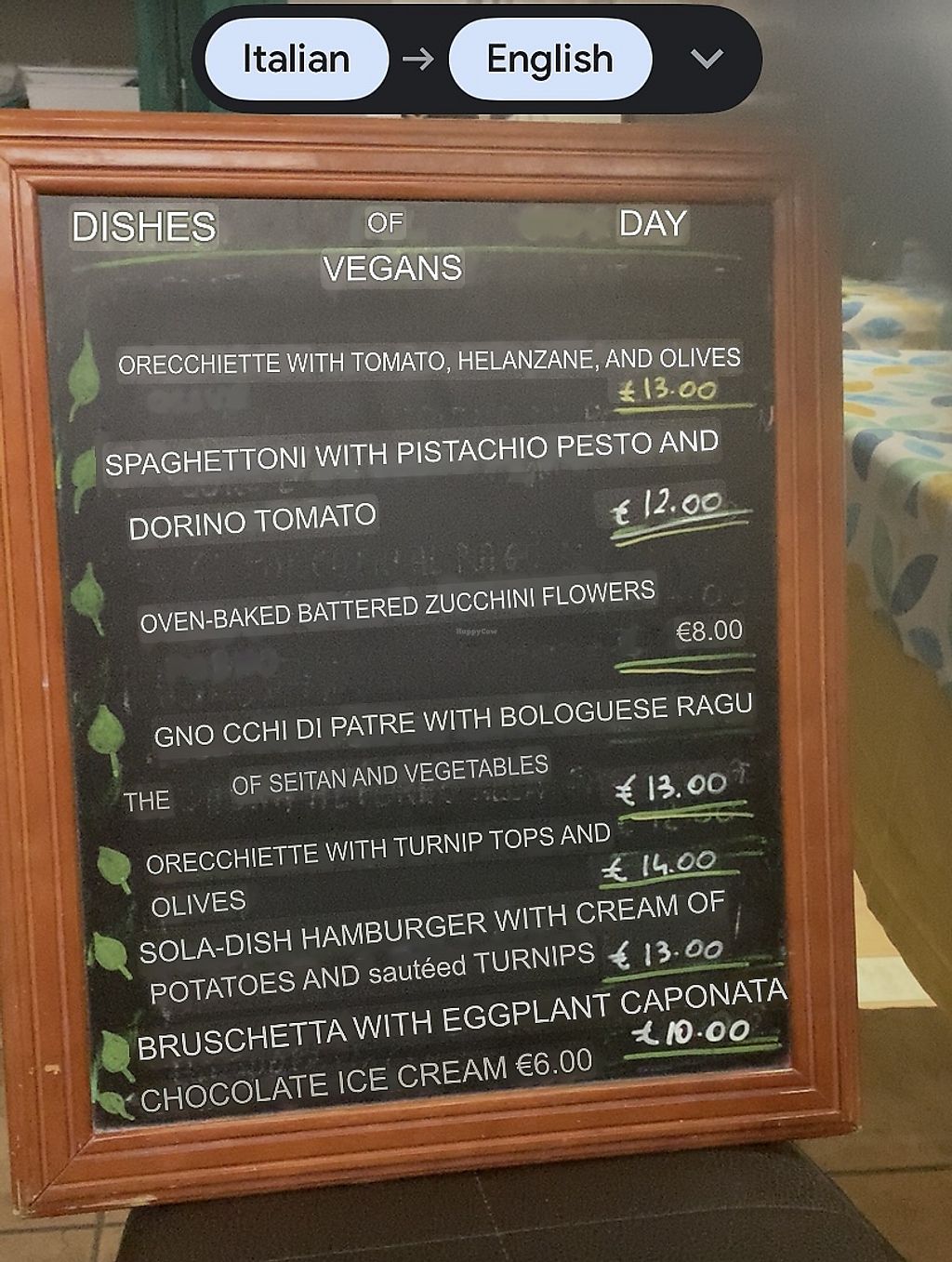 When we told the waiter we’re vegan he proceeded to turn over the menu board and there was a full vegan menu for us! Approximately 8-10 dishes all vegan. We had the Pea Protein Ragu and the Turnip Tortino Pie, with fried zucchini flowers on the side! It was all very tasty. The staff didn’t speak any English so would recommend going with phrases to let them know you’re vegan, and the menu was only in Italian so we weren’t 100% what we were ordering but it was all tasty.