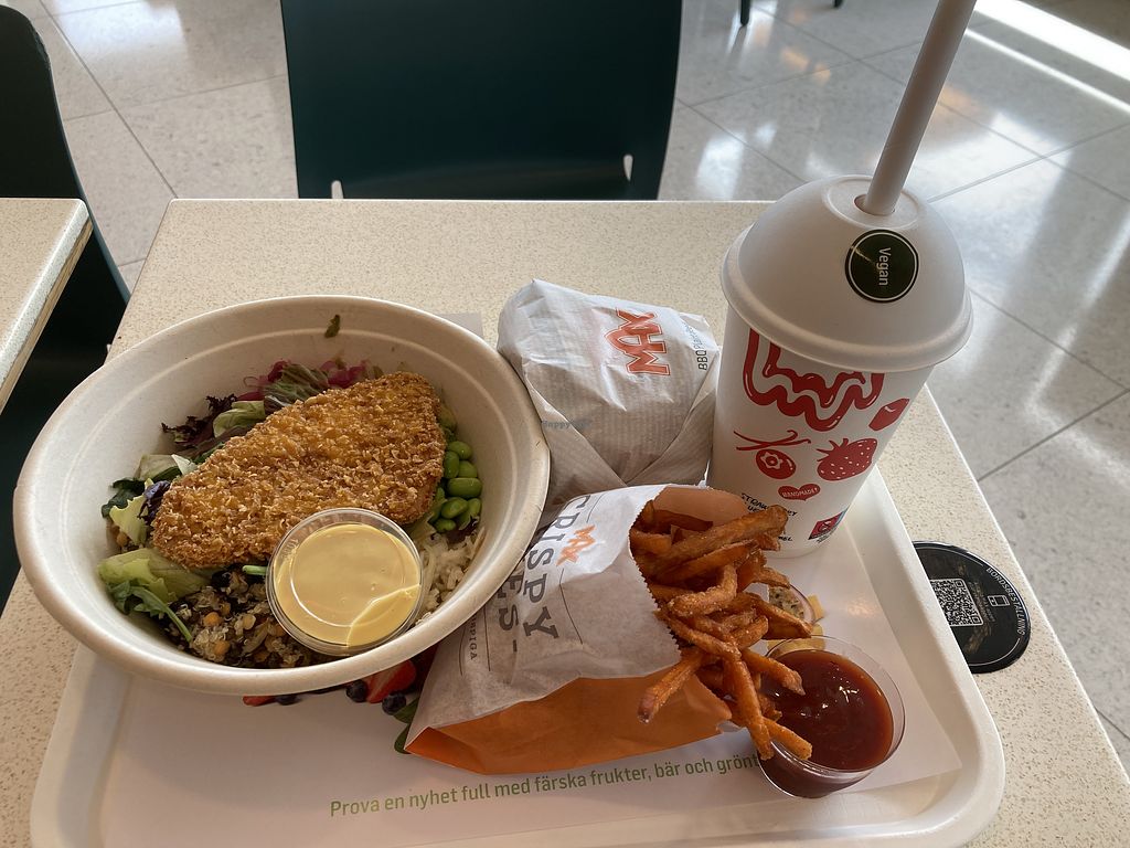 Serves meat, vegan options available. Fast food burger chain founded 1968 in Sweden and has since expanded to multiple countries. Concept is similar to McDonald's. Offers burgers, nuggets, fries, shakes, salads, and combo meals. Vegan options include a bbq sandwich, burger and vegan crispy no chicken (ask for egg-free mayo). The vegan dips include bbq, sriracha-ketchup, sweet n sour, and vegan mayo. Please note that many businesses in Sweden are cashless. Open Mon-Sun 10:00-00:00.