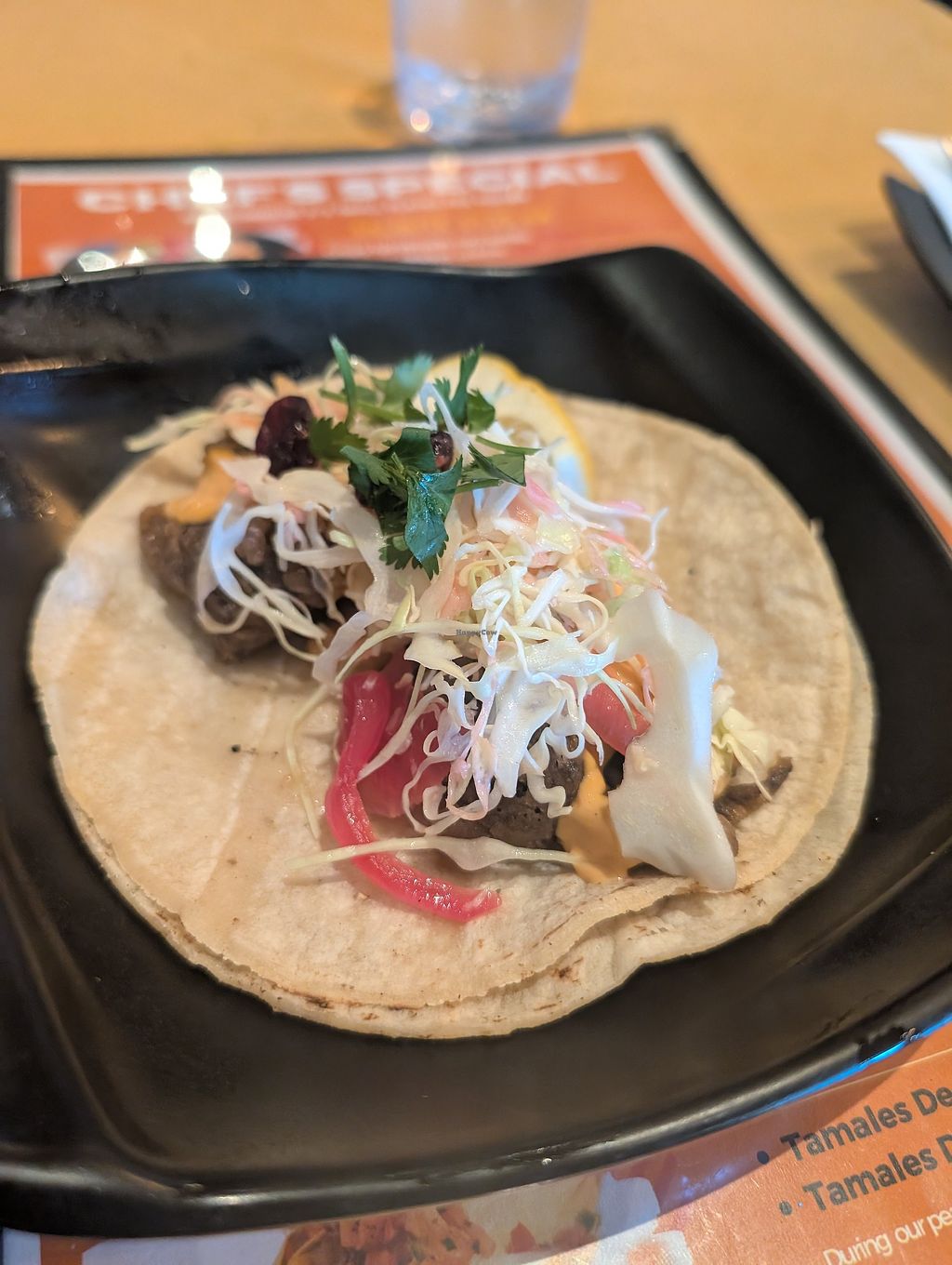 The vegan calamari taco was fantastic, would definitely recommend. The horchata was a bit sweet but still delicious, might be good to ask for less ice.