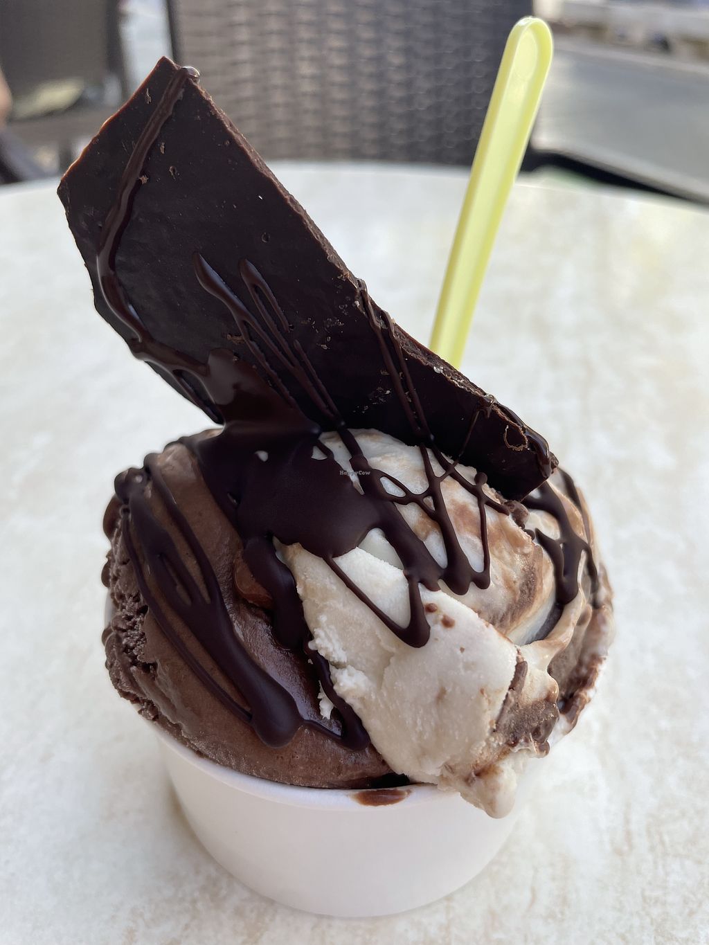 Dark chocolate sorbet and orange chocolate sorbet, both topped with a …