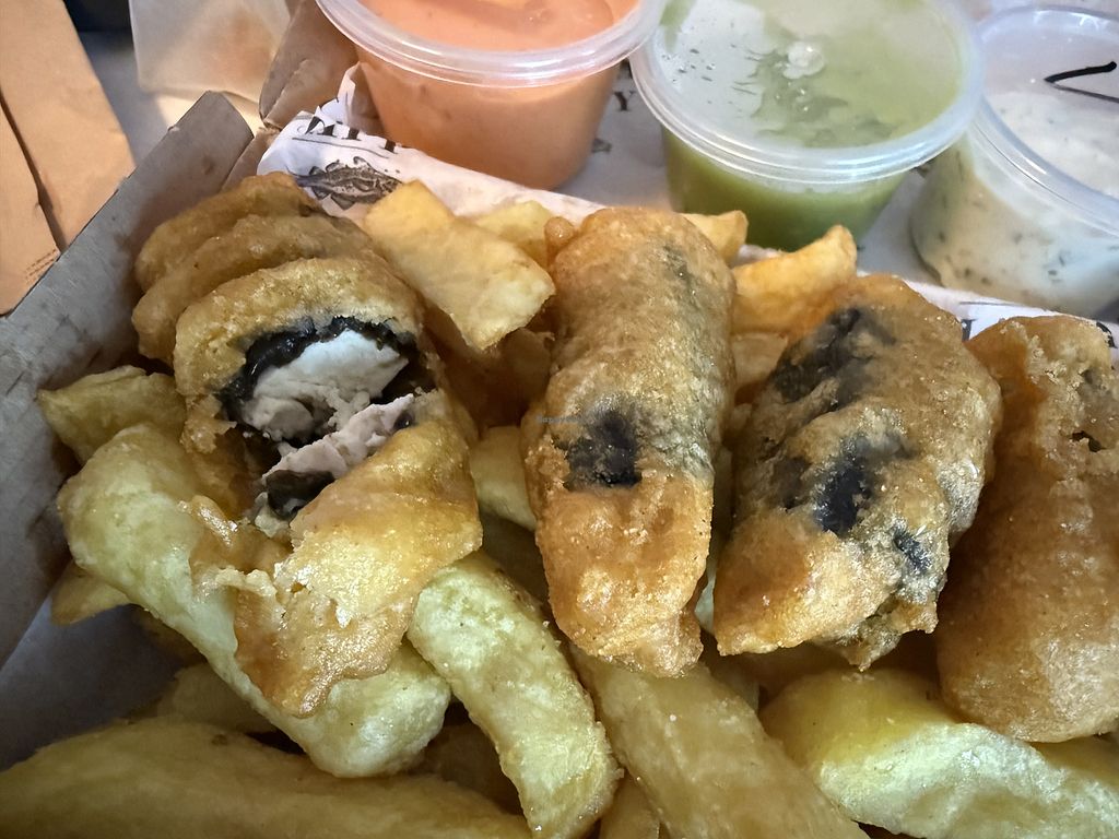 First of all there’s a line/queue so book ahead, be prepared to wait or order to takeaway. Everything was delicious!! Not greasy at all. Definitely was reminiscent of fish with the seaweed in there. Large portions. I had half when it was hot and half the next day straight from the fridge and it was still delicious. Mushy peas were excellent too. If you miss fish & chips since going vegan, you should enjoy this. I did immensely.