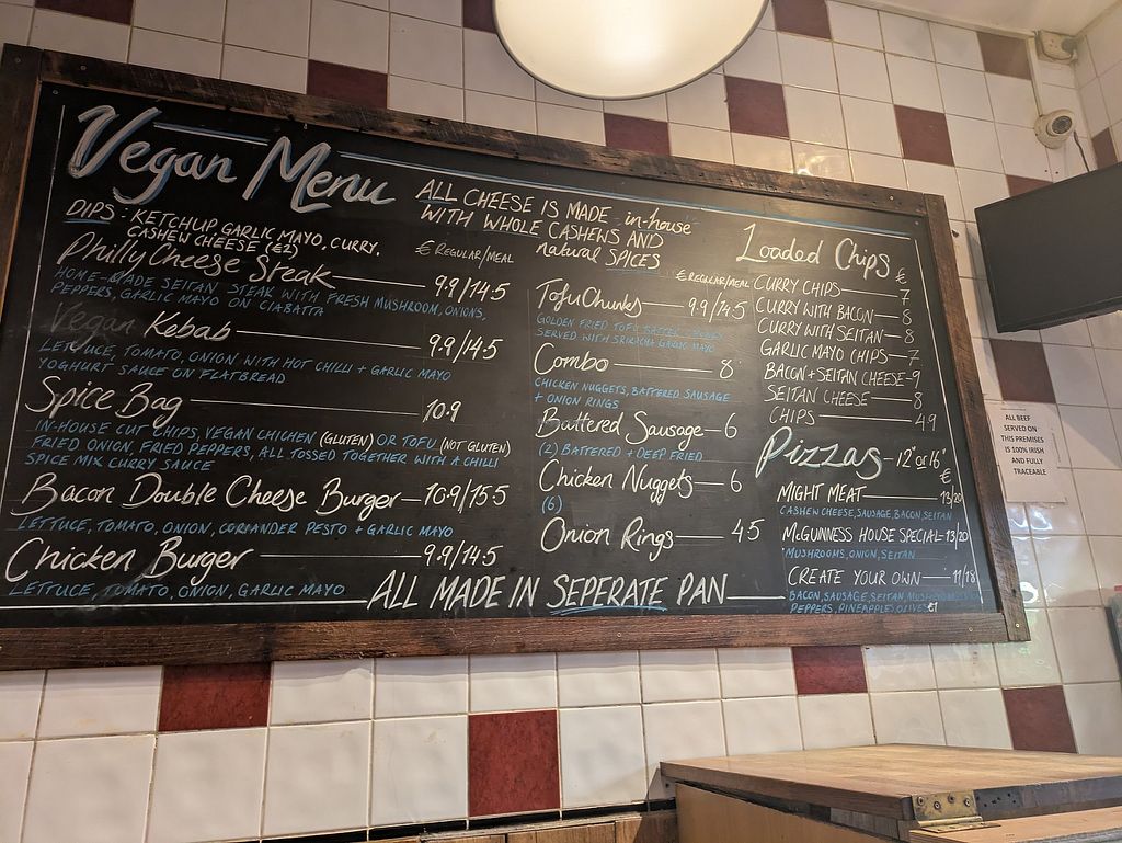 It is really, really wonderful to have a chipper in Dublin with a huge vegan menu!! Their philly cheesesteak is amazing and my favourite thing on the menu. Super reasonably priced, great staff, and worth any wait (it can get busy in the evenings).