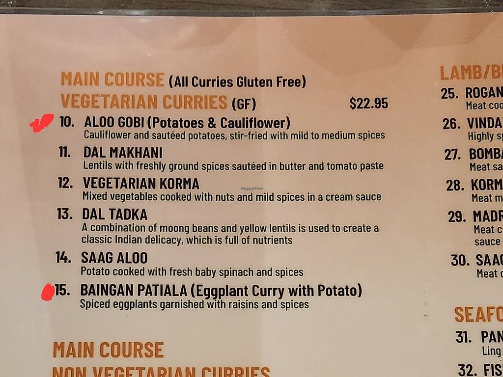 Read moreOf the items on the vegetarian part of the menu, only three items can be made vegan: Aloo Gobi, Baingan Patiala, and one of the lentil dishes (I unfortunately can't remember which one they said was able to be made vegan!). (Make sure to specify that you want it vegan, just in case)