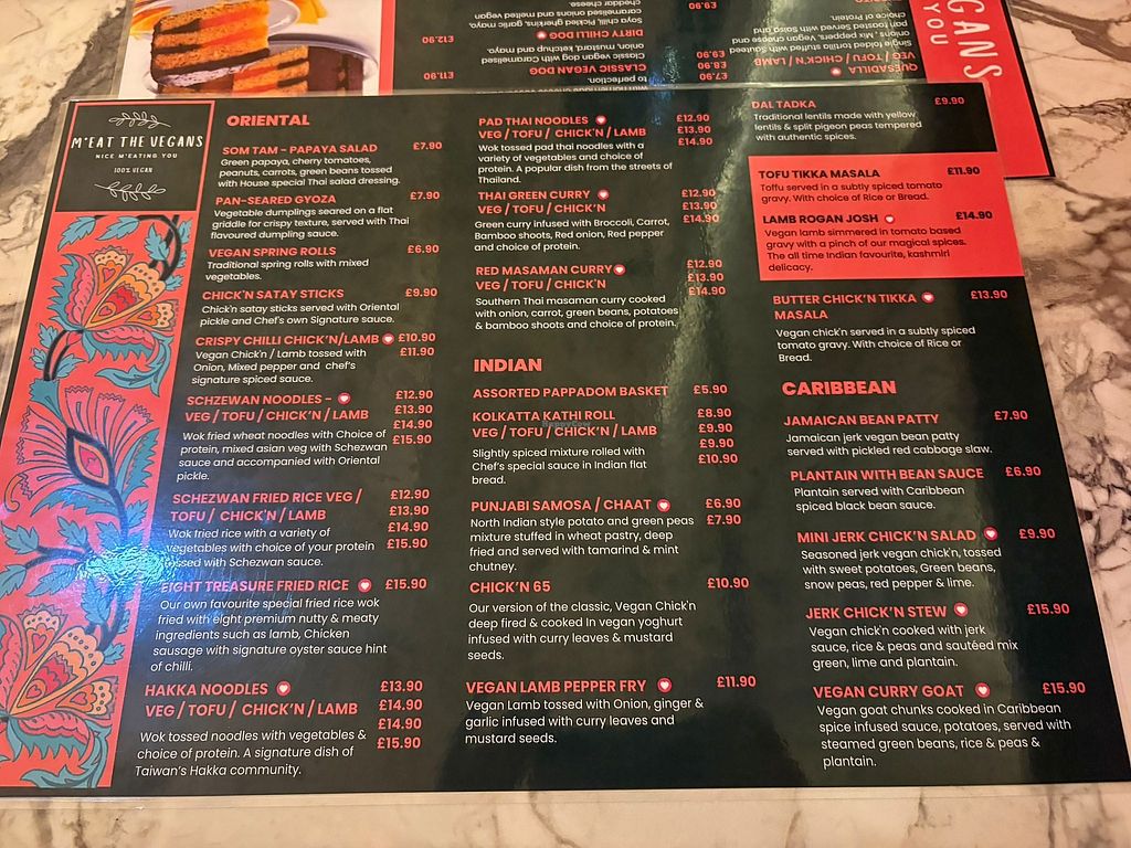 Really big menu with lots of choice! The Caribbean goat curry (never had Caribbean food before) was the best thing I have ever had. The butter chickn was also beautiful. Lovely place and fantastic service