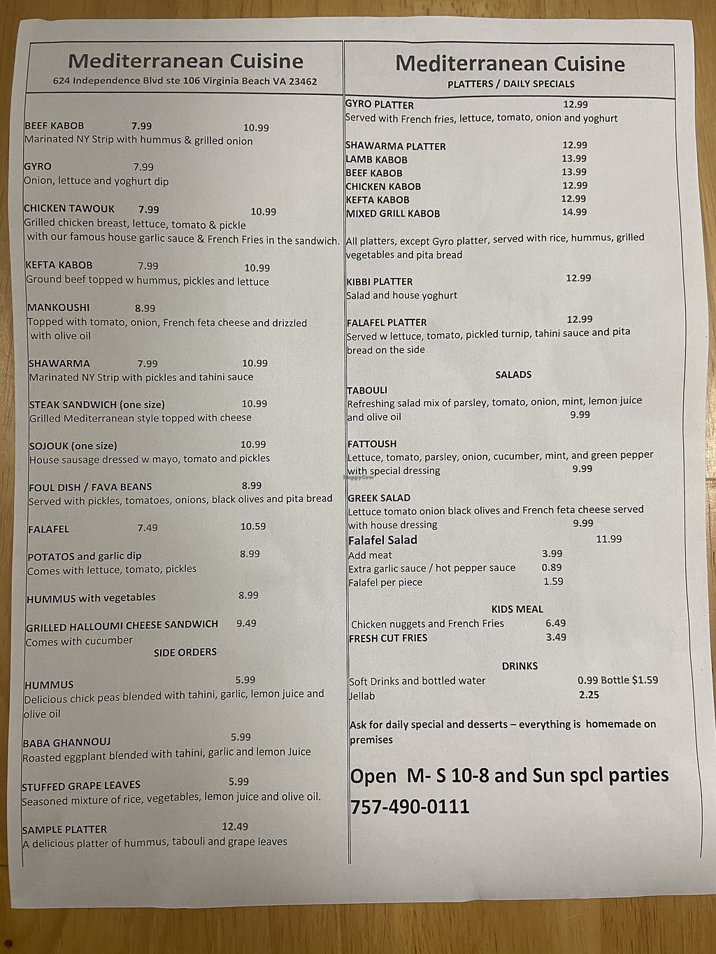 Searched for Falafel places in the Va Beach area the main two we already knew so decided to try this one. Fantastic! Hummus and Falafel very moist!! Not dry like others we have tried! If your looking for the real thing and not an American copy this is the place to go. Best falafel in va beach in my opinion.