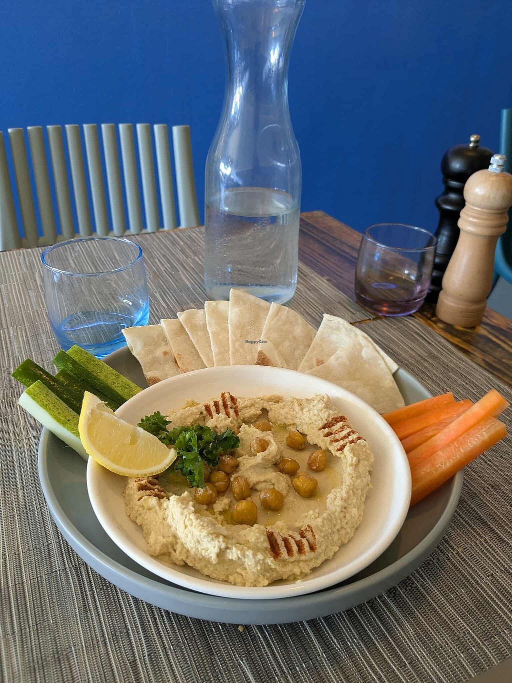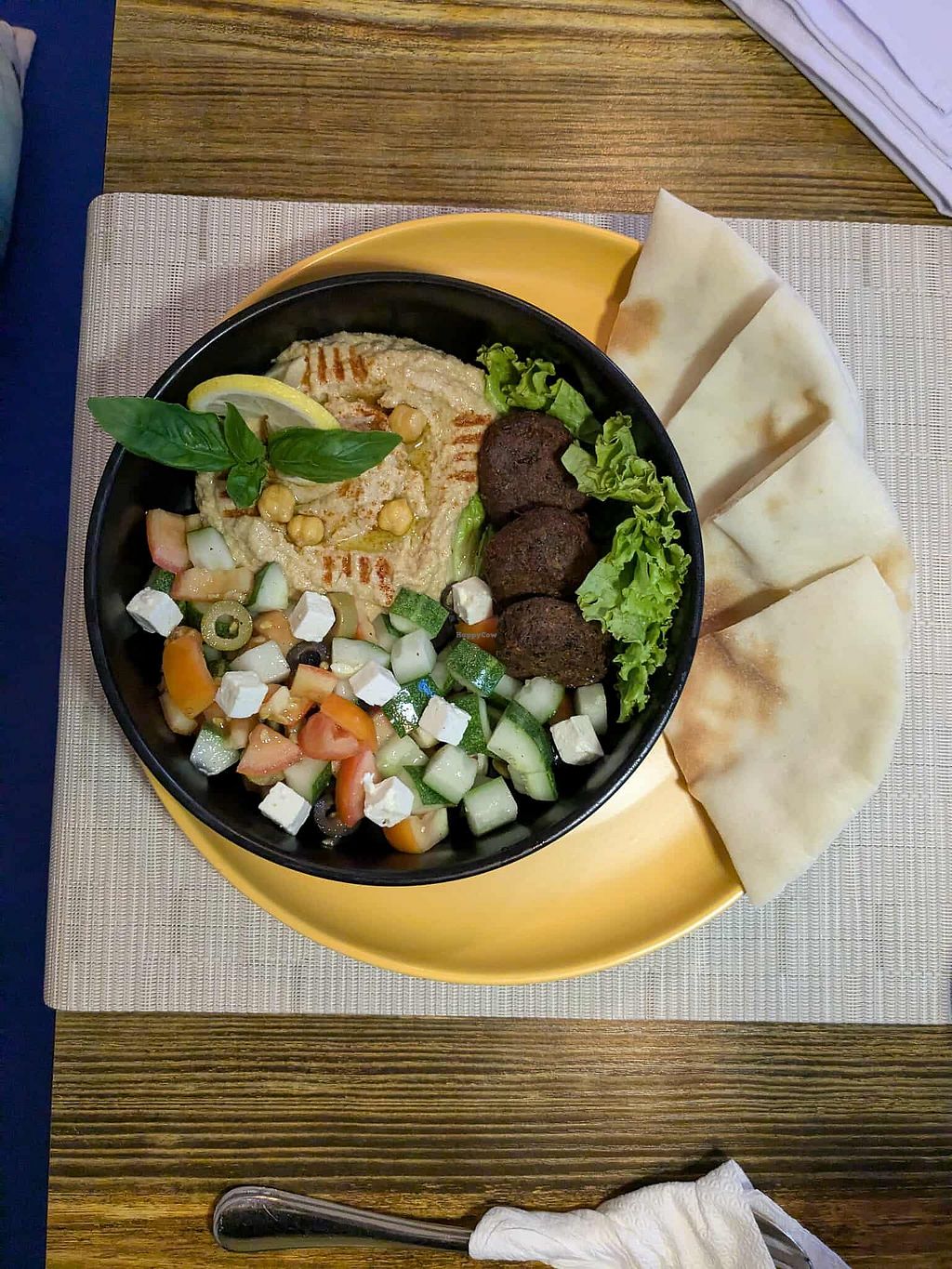 Serves meat, vegan options available. Mediterranean restaurant with vegan options such as hummus with veggies and pita, vegan burgers, and wraps that can be made vegan upon request. Ask to omit any non-vegan ingredients. Open Mon-Sun 7:30am-12:00am.