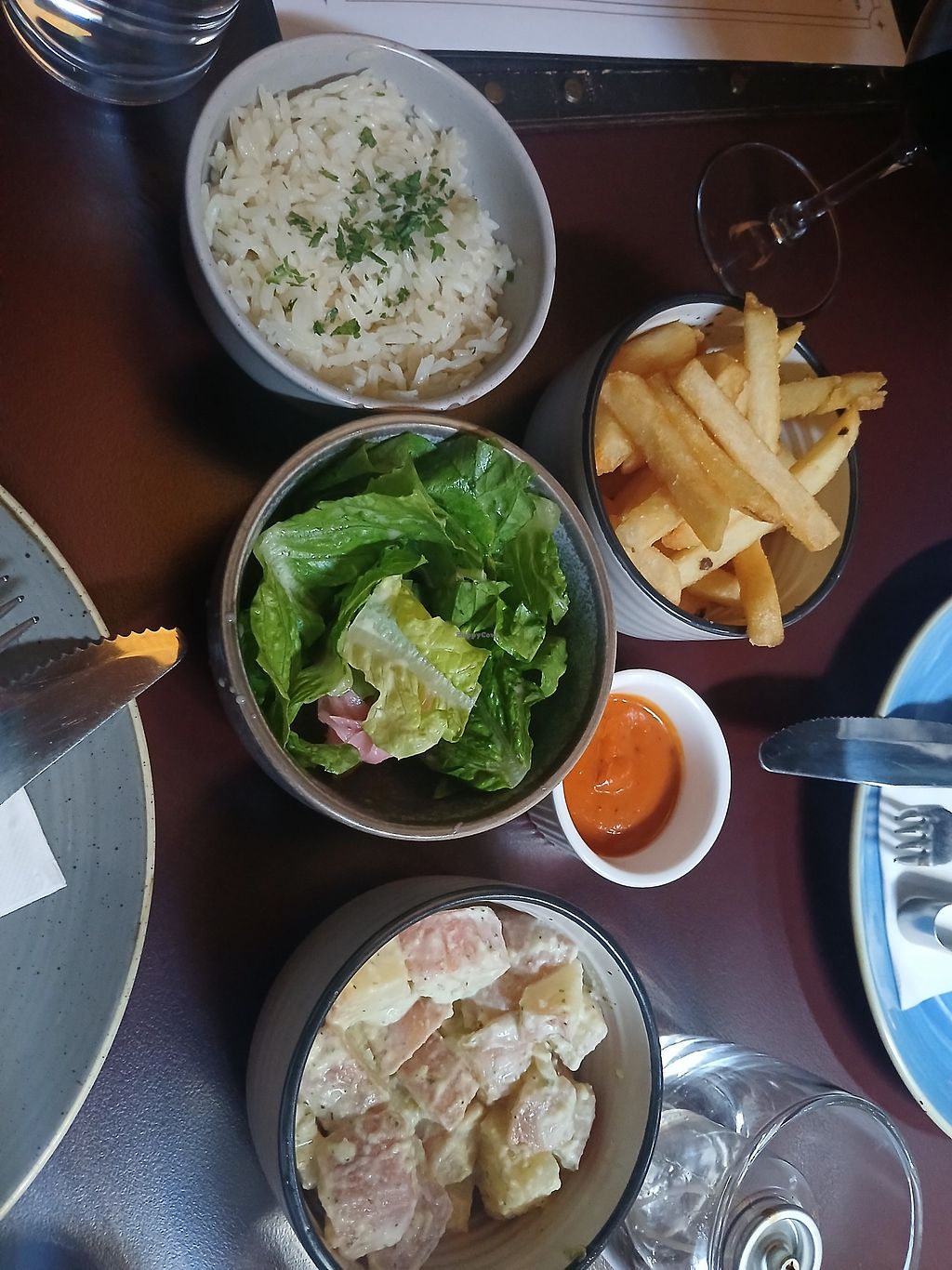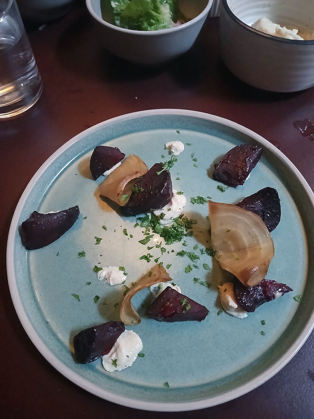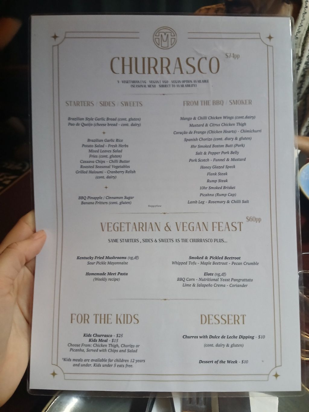 I guess I shouldn't have been surprised that such a meat focused restaurant was disappointing. The vegan feast menu was fairly tasty and good value. The service was just a bit lacking. I was given a green plate so waiters knew I was having the vegan menu. I was still offered meat numerous times. My final dish had a huge delay and arrived with cheese on it. I had the vegan feast which included shared sides and four dishes. Some of the food was really salty the cinnamon pineapple at the end was the highlight. Cute looking but gross sangria.