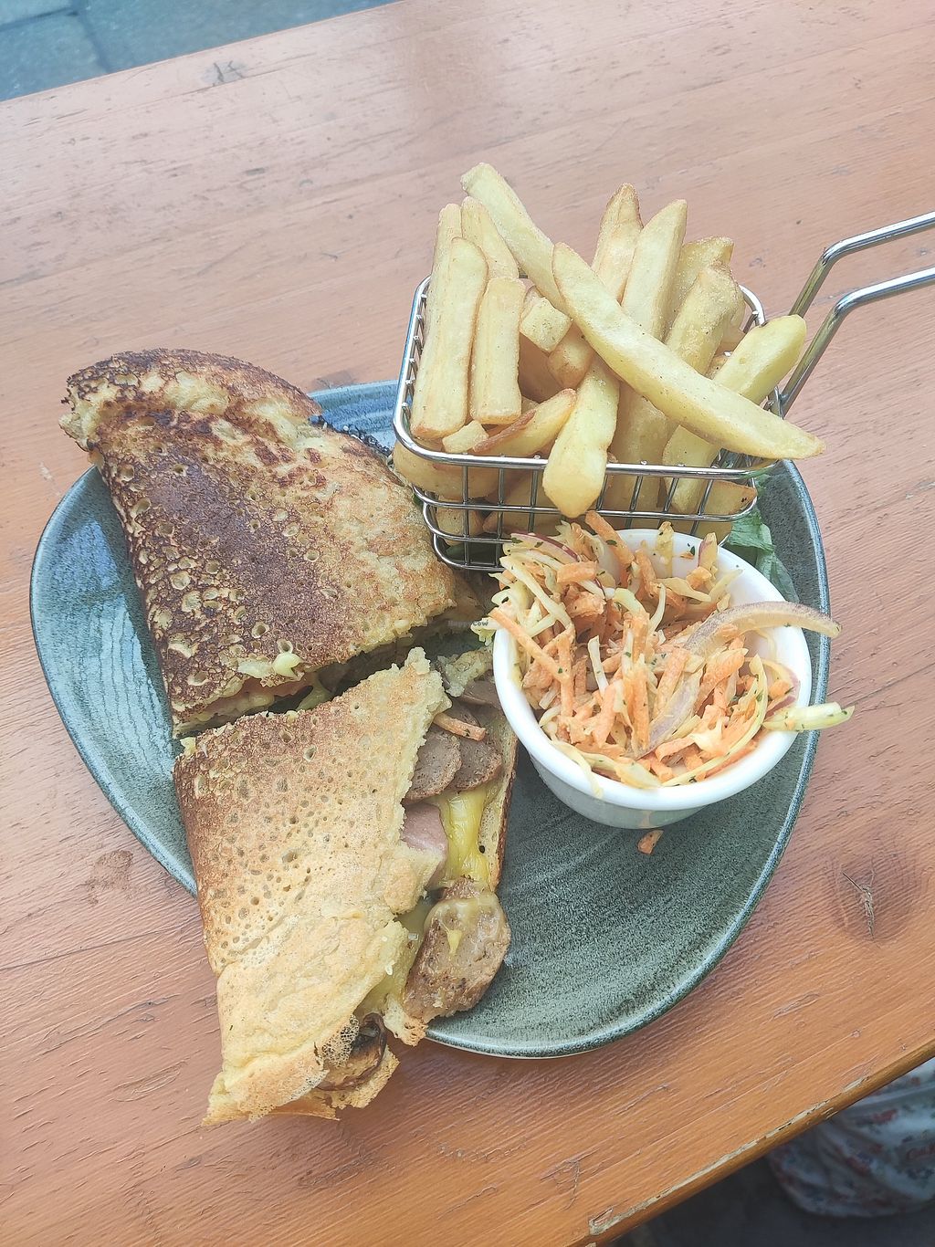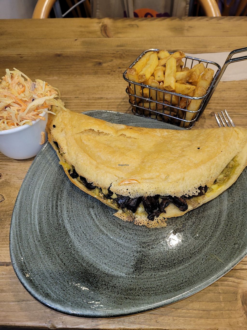 Read moreI opted for vegan egg omlette stuffed w/ mushrooms cheese and pesto and it was mindblowing! Chips were perfectly seasoned and homemade coleslaw was lush. 😍🤩 partner ordered sausage chips and beans and it came barely warm in a tiny bowl so if ordering off menu maybe specify it isn't for a child 😆😂😂