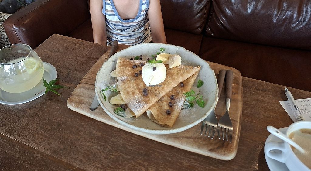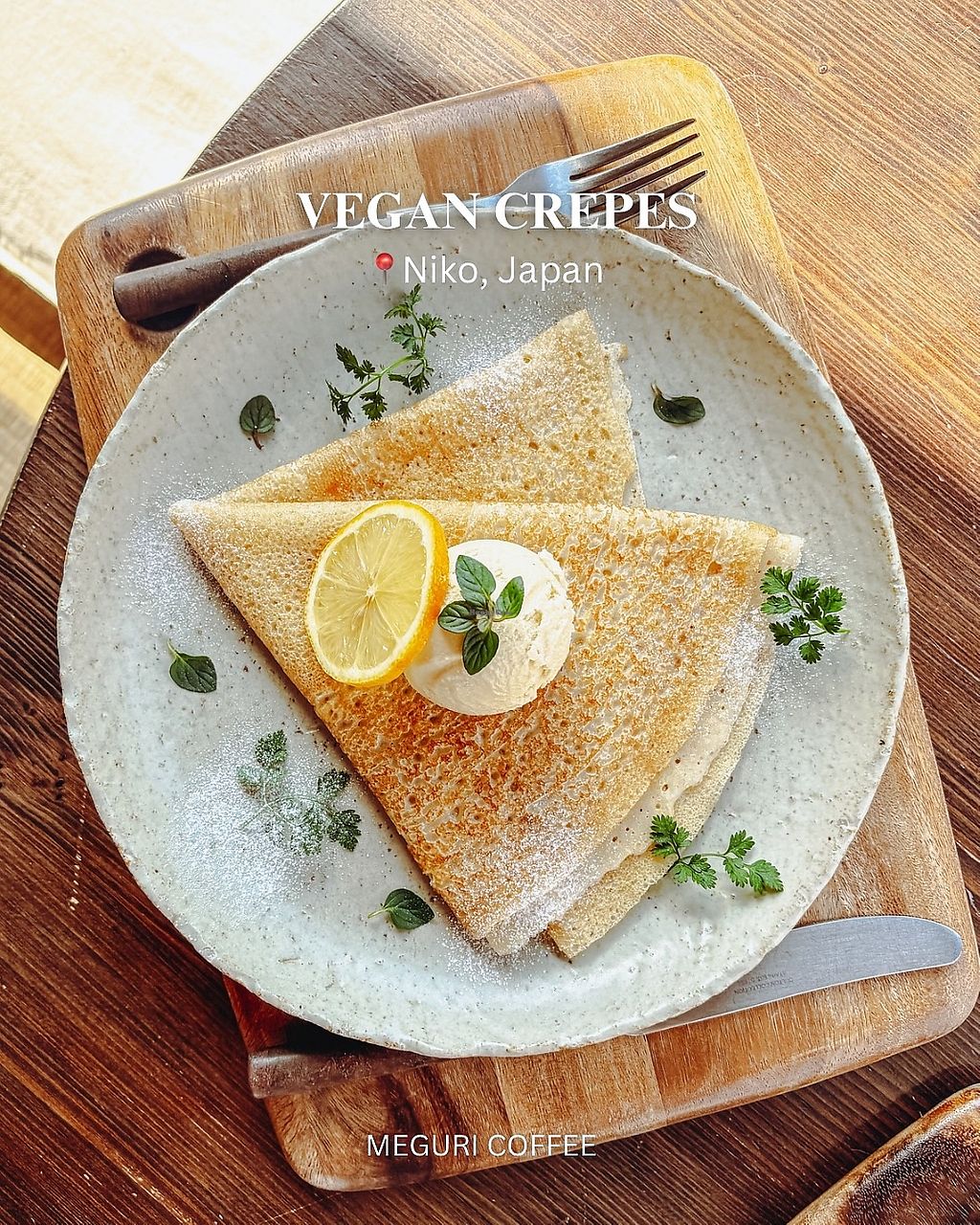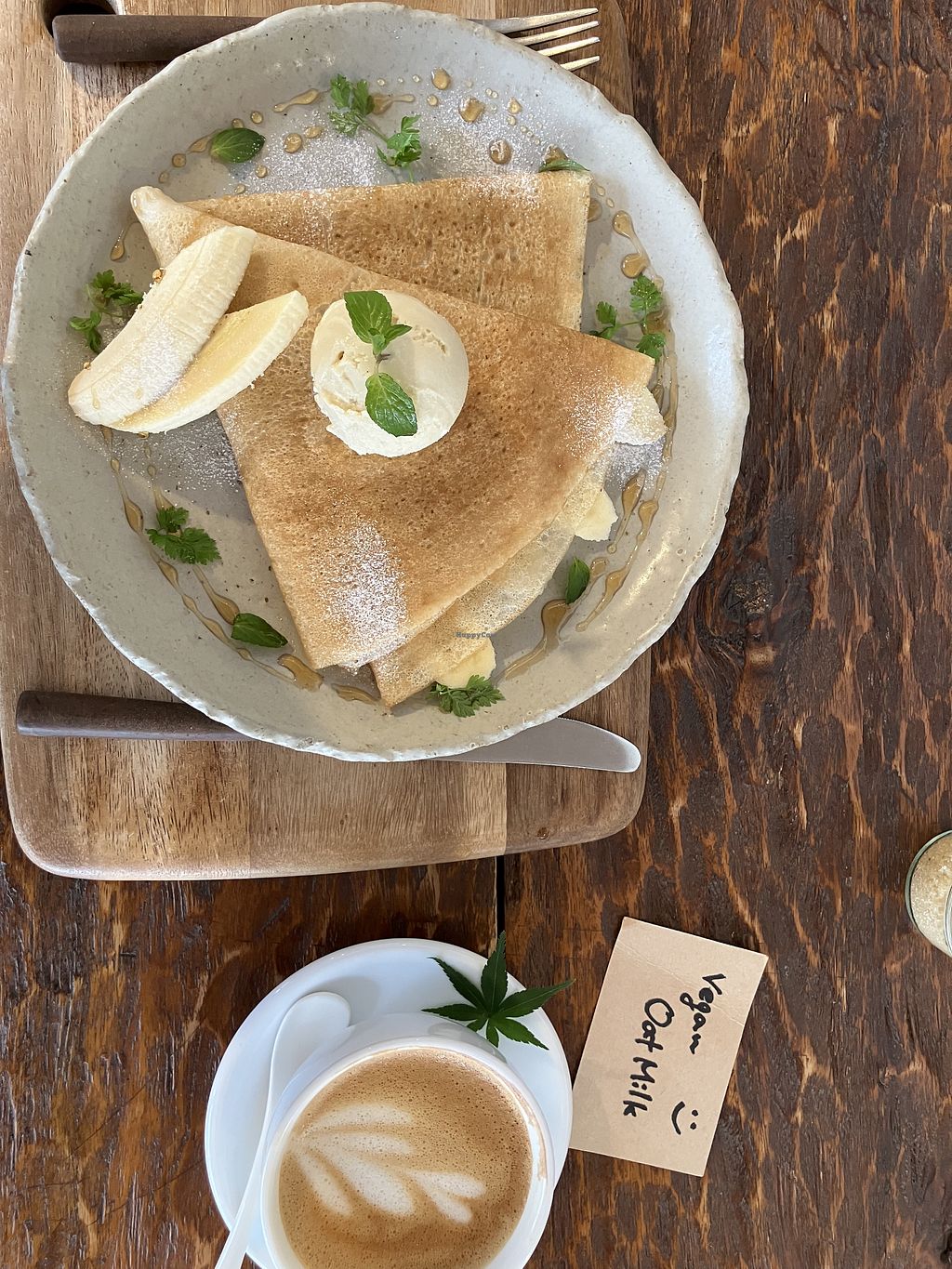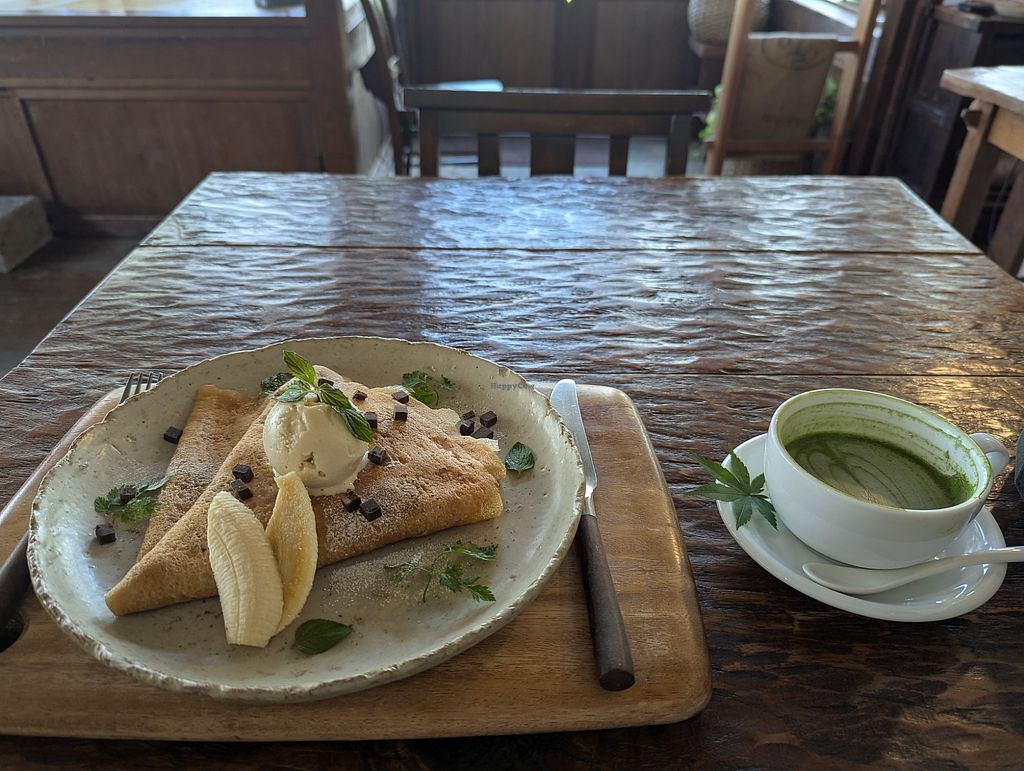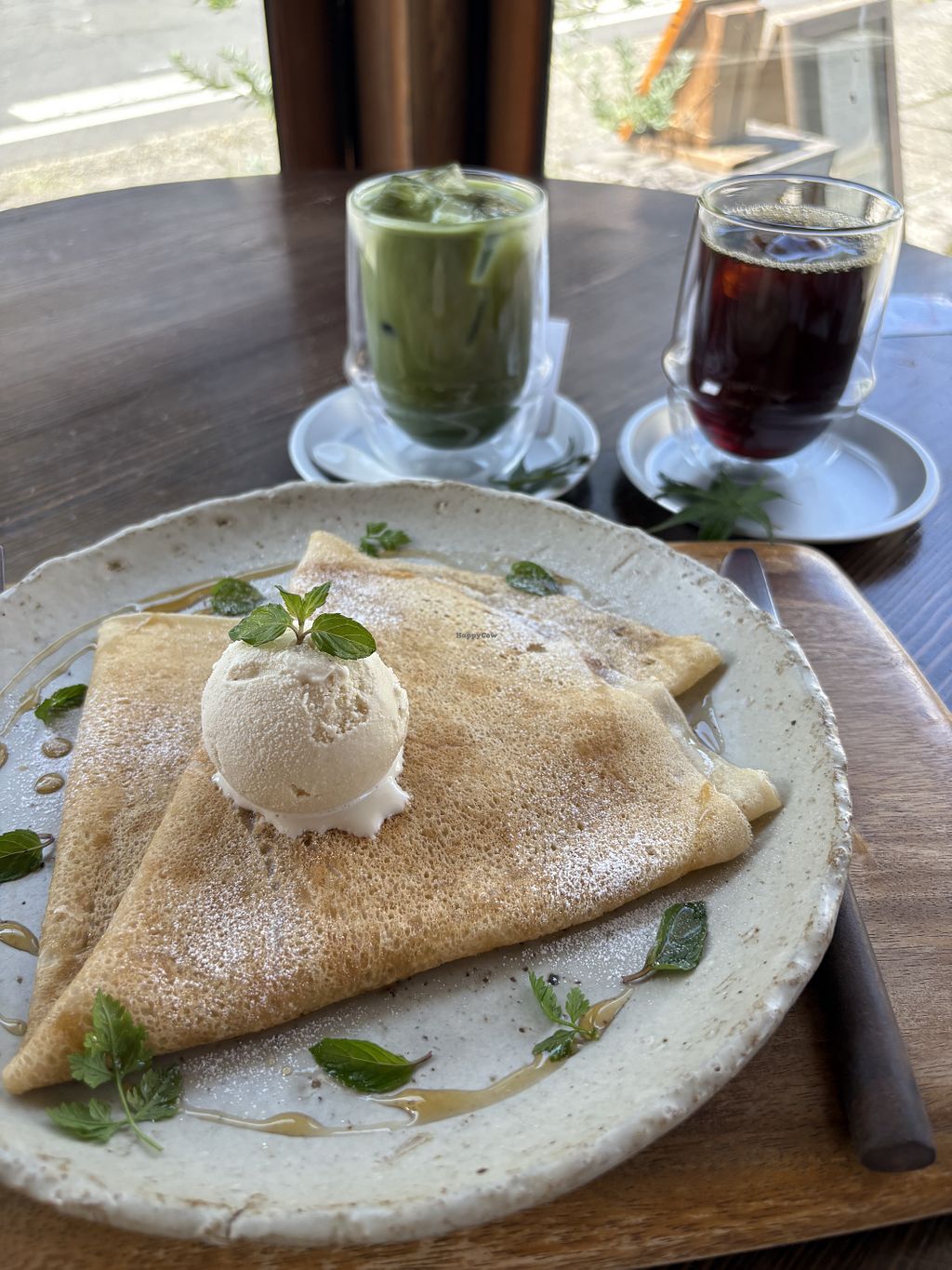 Vegan Crepe with Matcha Latte and Iced Coffee