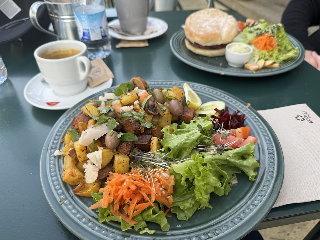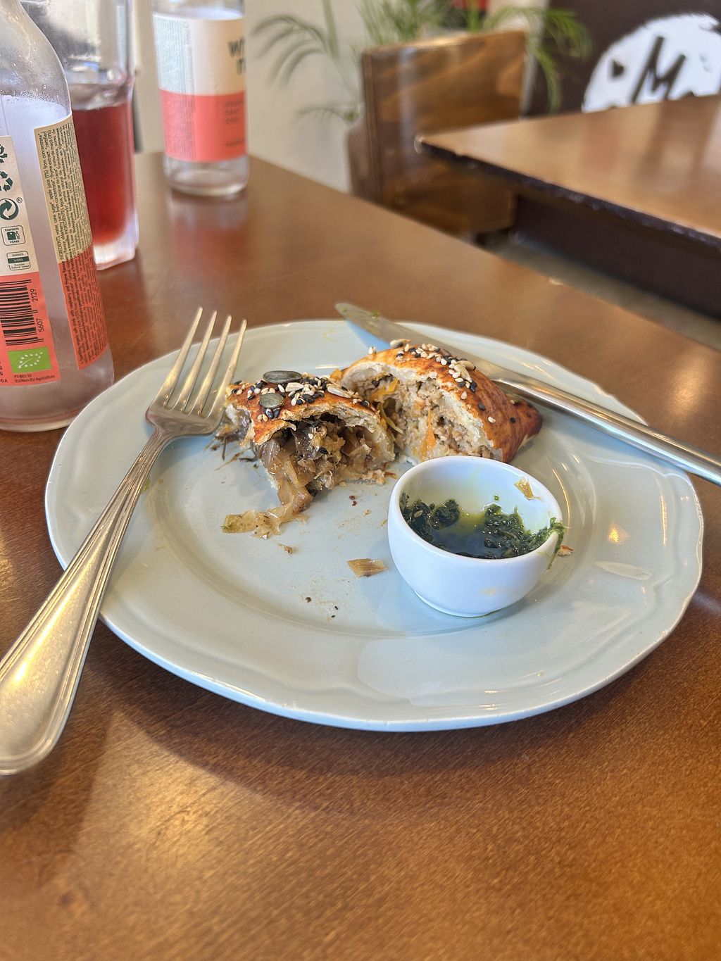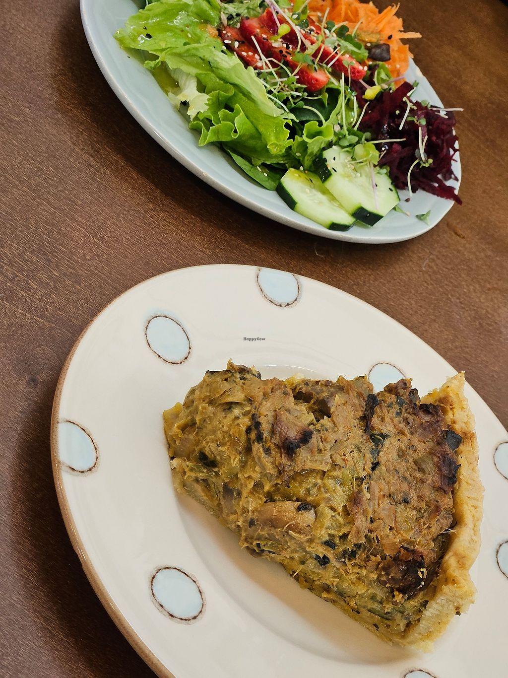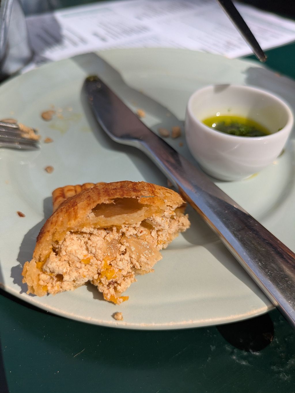 Courgette soup, spinach and mushroom quiche, seitan empanada.