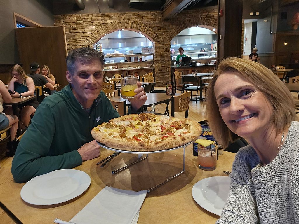 Vegan pizza, tempeh on all, half onions and pineapple and half caramel…
