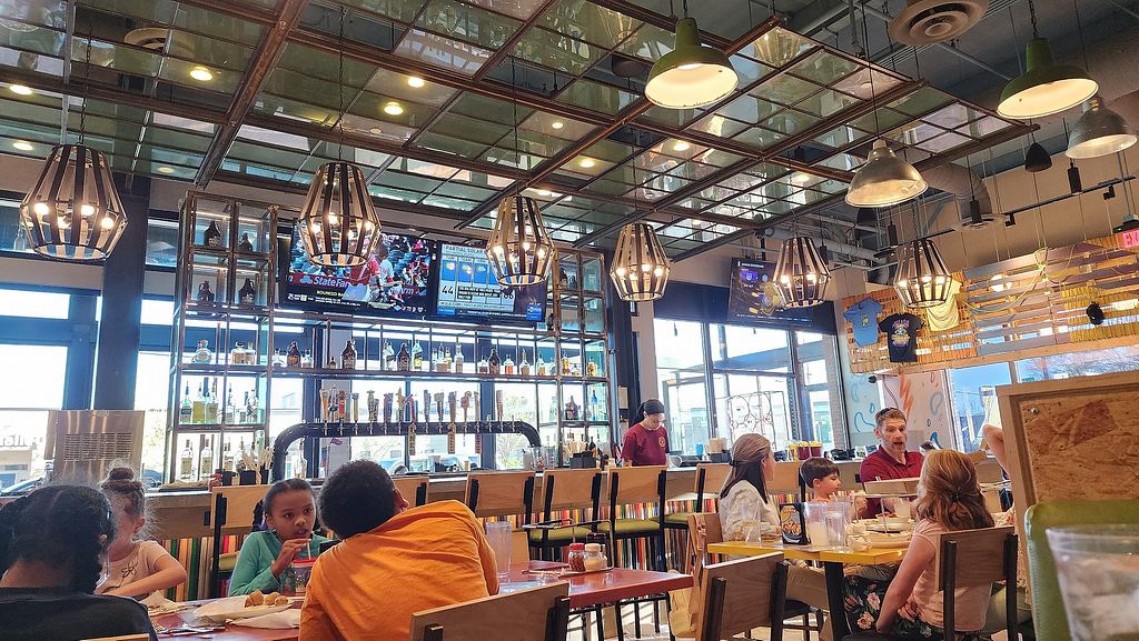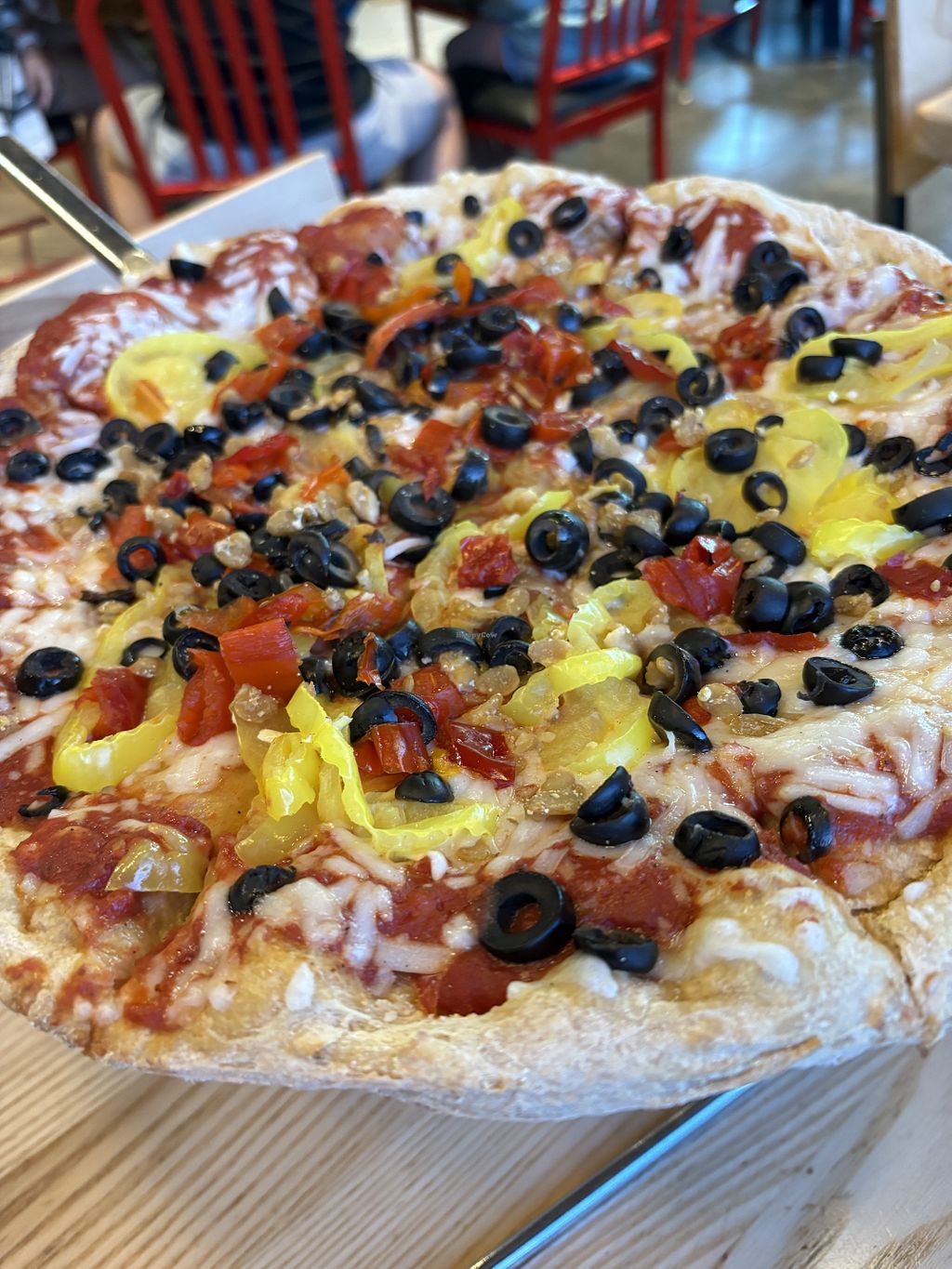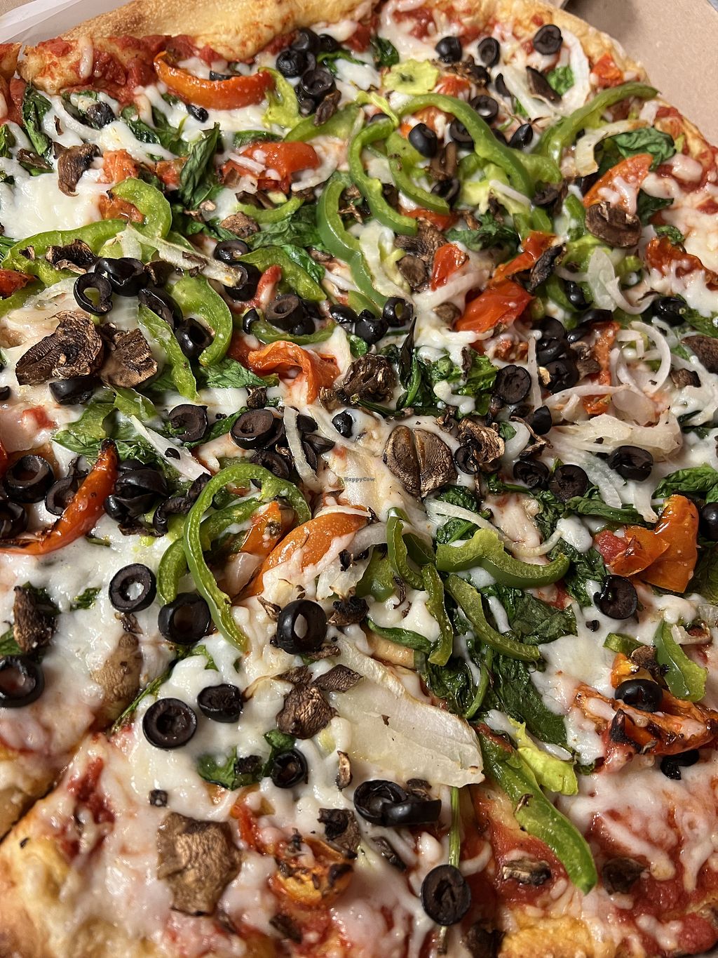 If you order the “veggie pizza” REMEMBER to specify the cheese. This place also takes a LONG time to make pizza. Very expensive as well. We usually only come here for a special treat. Can also get a vegan calzone if you build yourself. Unfortunately to make anything worth while here you have to add a lot of toppings for 1.99 each which gets pricey.