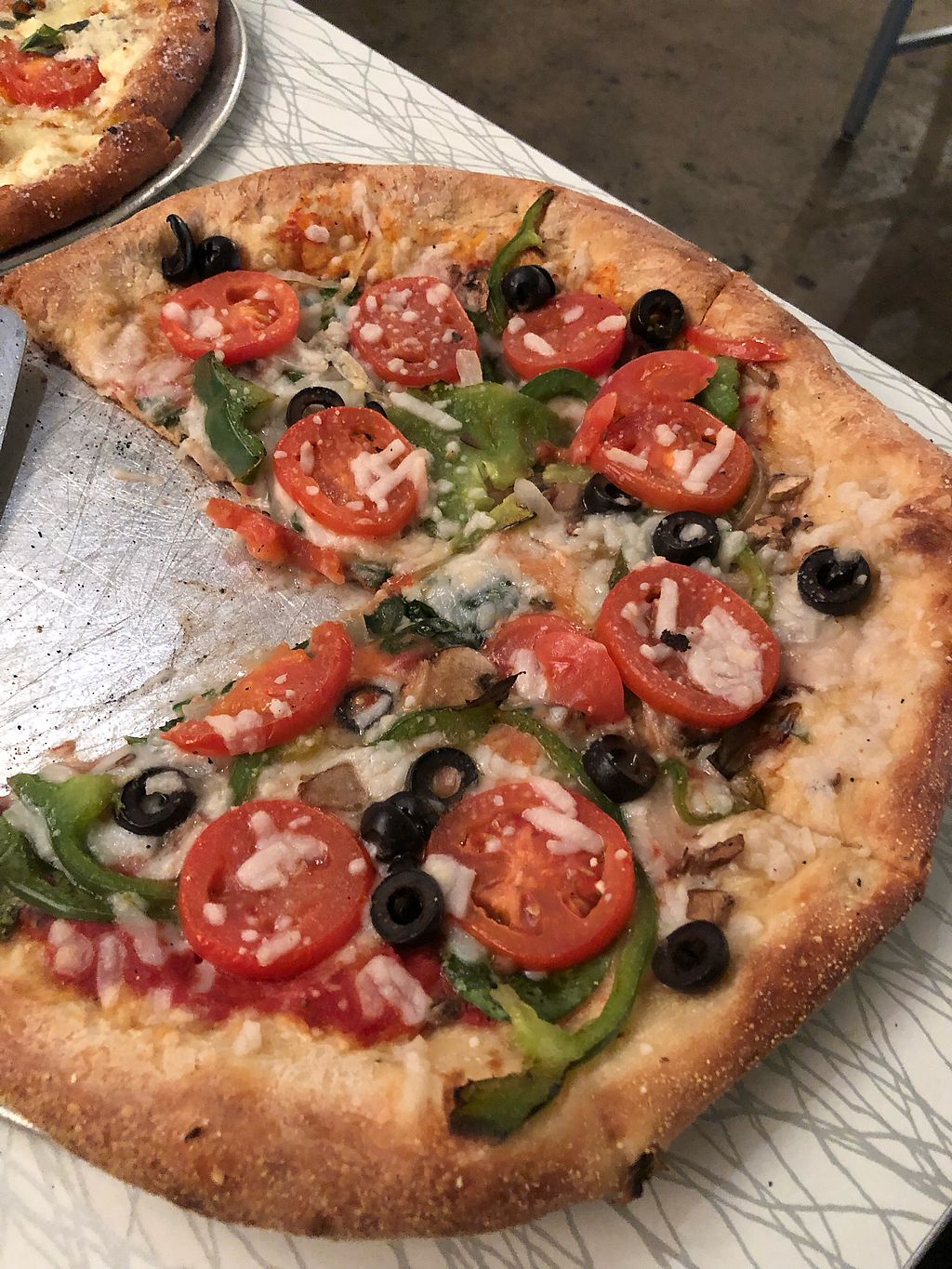 Came on a Monday night. They were out of vegan cheese, no big deal. Loaded pie with lots of veggies, sauce and crust were great. Pie delayed bc by accident chef put parmesean on crust. Appreciated the honesty/vigilence. We were in no hurry and not upset, but manager came over and bc of no cheese and delay, comped the pie! So nice. And so delicious! Awesome decor. Lovely staff. Will return. (Would have given 5 stars if allowed.)