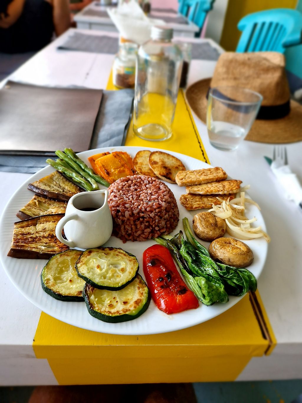 Whilst travelling in Amed when I feel like retreating into a brightly coloured cocoon, I choose Melon Cafe, it's decor is uplifting, it's air conditioned & whilst right on the road, it's so quiet. I've eaten lots of vegan options here over my visits. I've eaten mains, snacks & smoothie bowls. My partner had cinnamon porridge on our last visit. I also enjoy the view whilst sipping my tea from a glass teapot & mug.