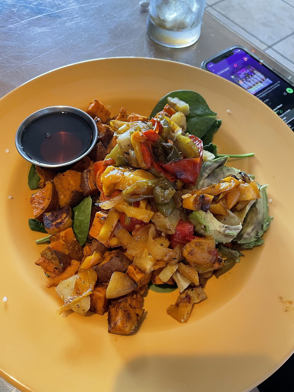 The coffee (decaf for me) is smooth and strong- none of that acidic junk. I built my own bowl with roasted sweet and regular potatoes, fresh spinach, tomatoes, avocado and habanero maple dressing. It’s a flavor explosion. It’s also fresh and healthy, so a huge win! The server is super nice and the place has a great beach vibe.