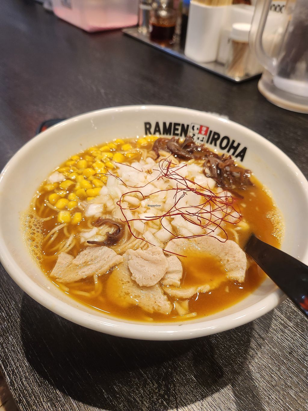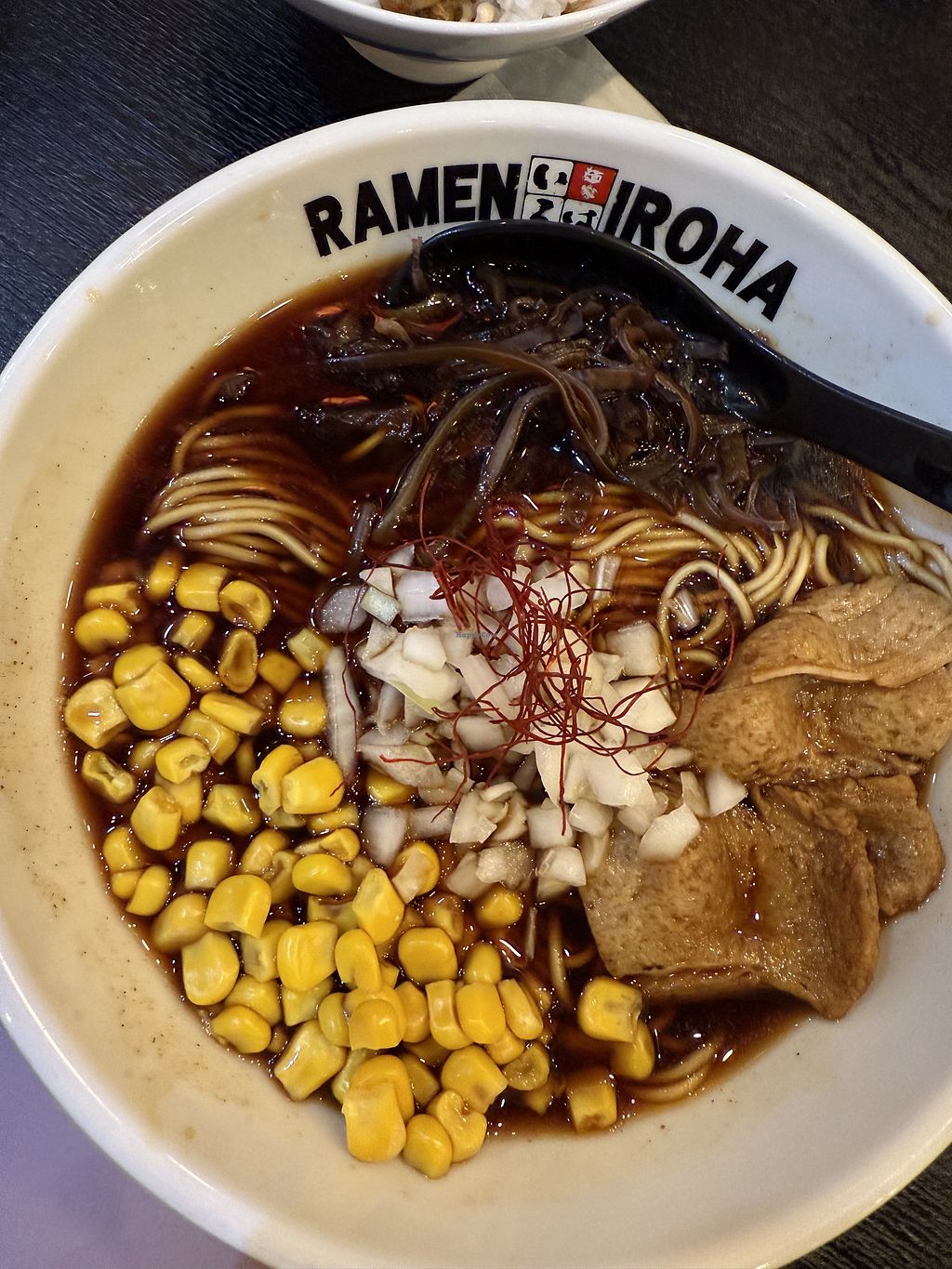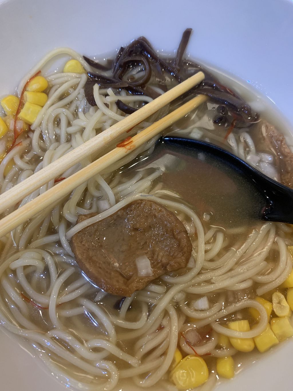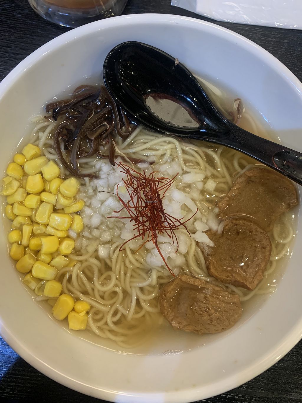 Had soy based broth came with soup, slices of soy meat and some onion, added topping corn. All in all a decent option in contrast to other ramens that have included just vegetables. Found the soup a bit strong tasting with soy.