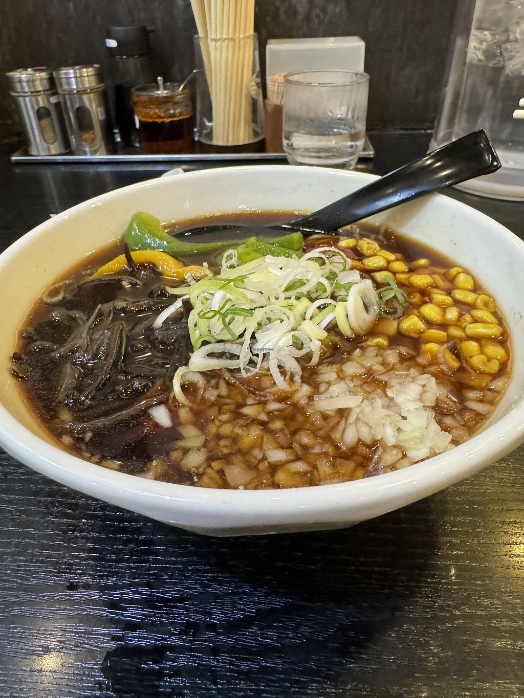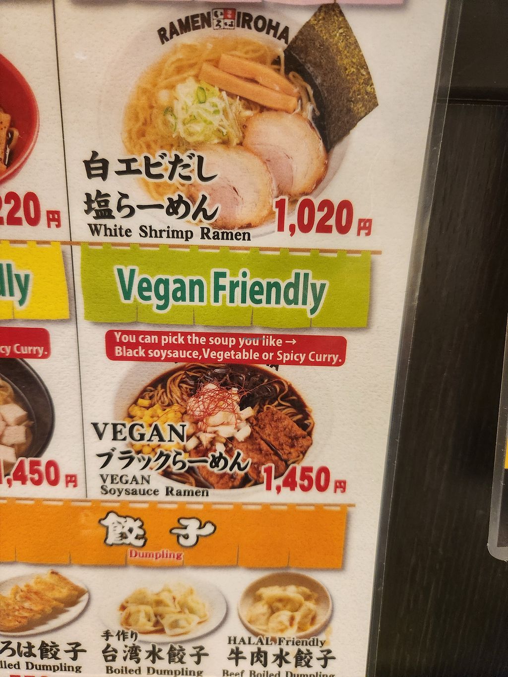 Ich hatte ein sehr leckeres veganes Ramen (soße Vegetables, konnte aber auch Sojasoße oder Black bean wählen). Dafür das es selten vegane Varianten gibt war ich mega happy. Und 1500 yen hat’s gekostet im Gegensatz zum Ramen gegenüber.