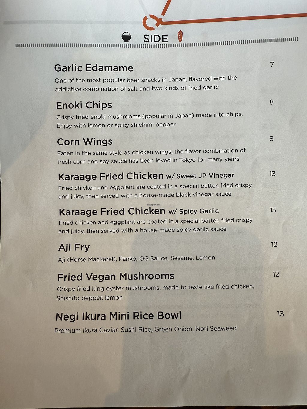 Serves meat, vegan options available. Japanese restaurant serving ramen and a variety of sides. Offers 3 vegan ramen choices (garlic knockout, cauliflower tantan, botanical yuzu and fried mushrooms). Also has several vegan sides such as corn wings, enoki chips and fried mushrooms.