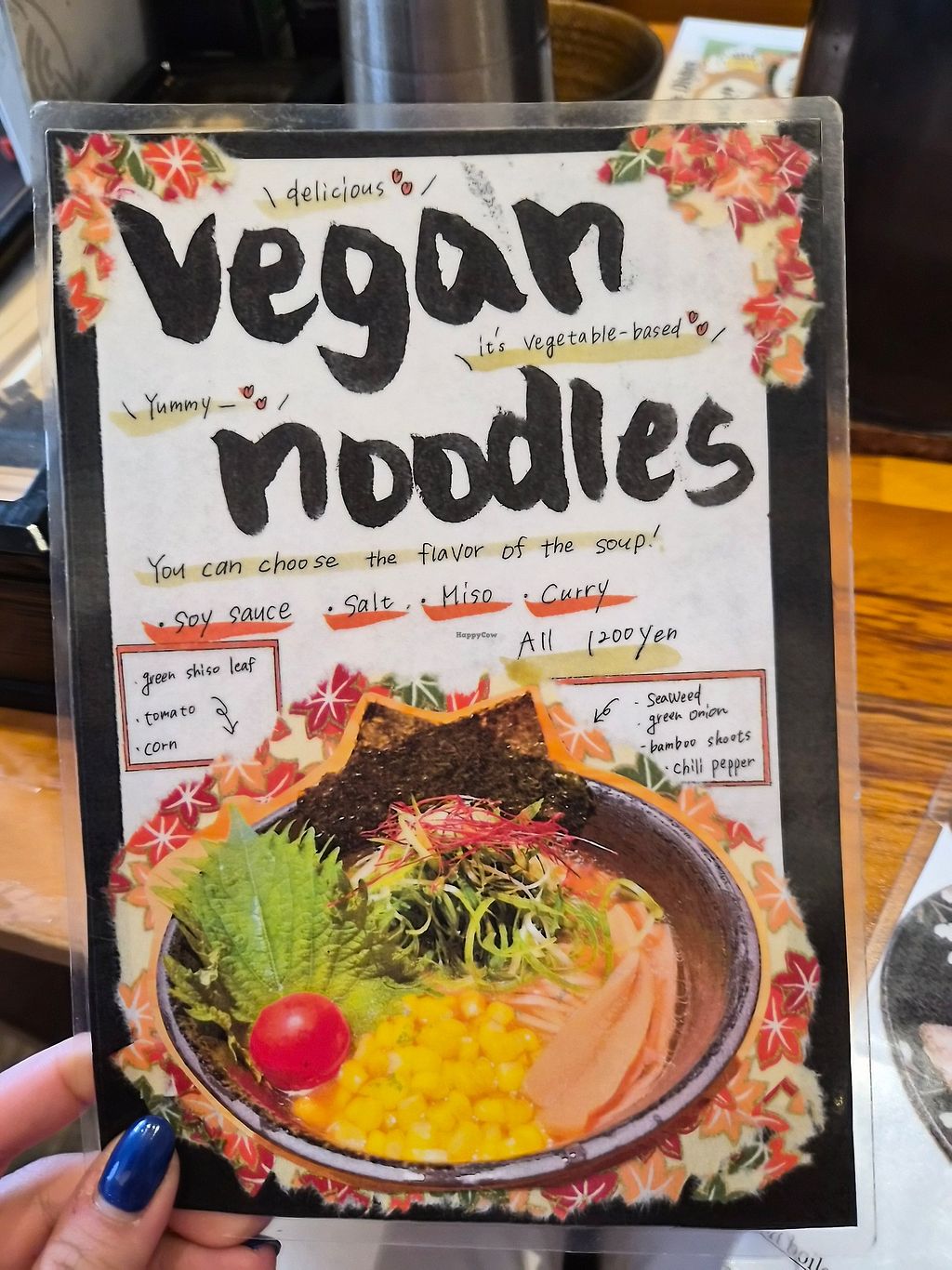 Read moreWhen I came inside the store I got the normal english menu, however, this does not contain the vegan ramen. I had to ask for it and they give you the menu which contains only one ramen variation where you can choose miso, salt, soy sauce or curry as base for the broth.