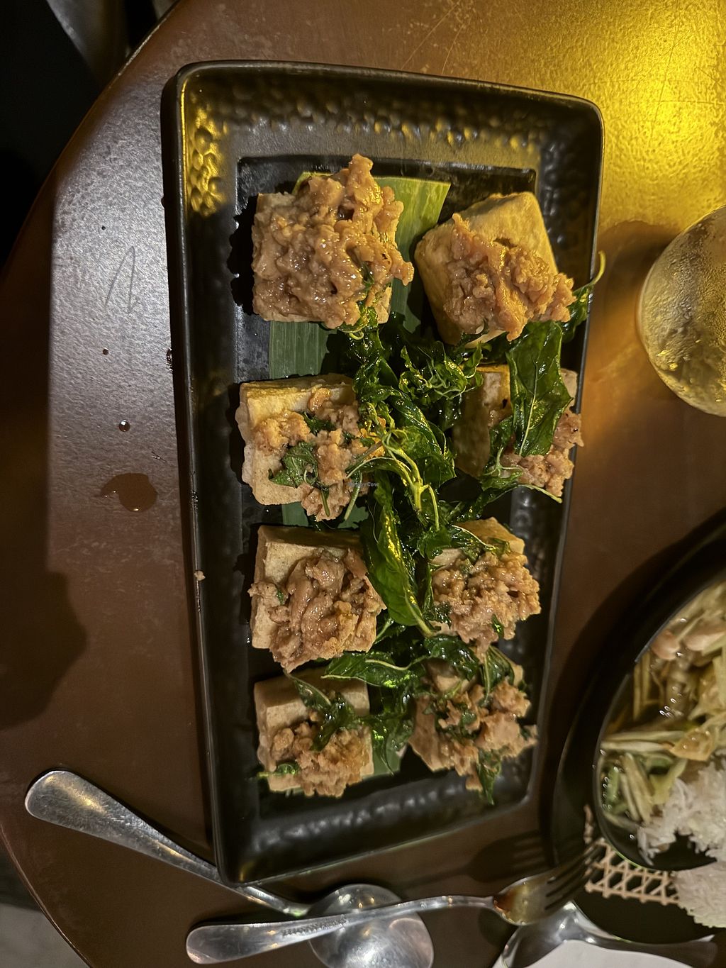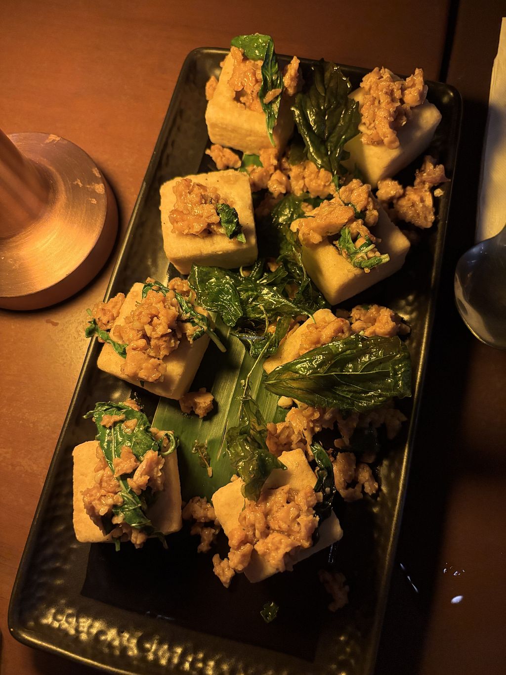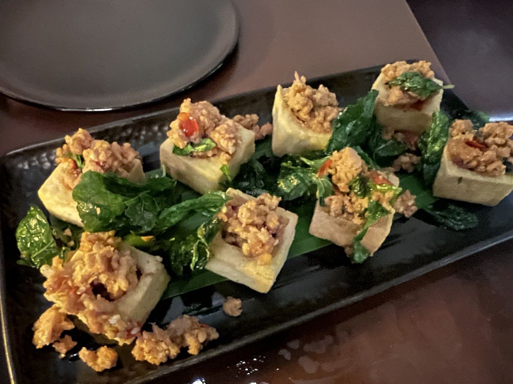 First night of my trip, excited to find a vegan spot open late. Got the fried minced tofu stir fried with holy basil and an iced la Dan lemongrass juice!