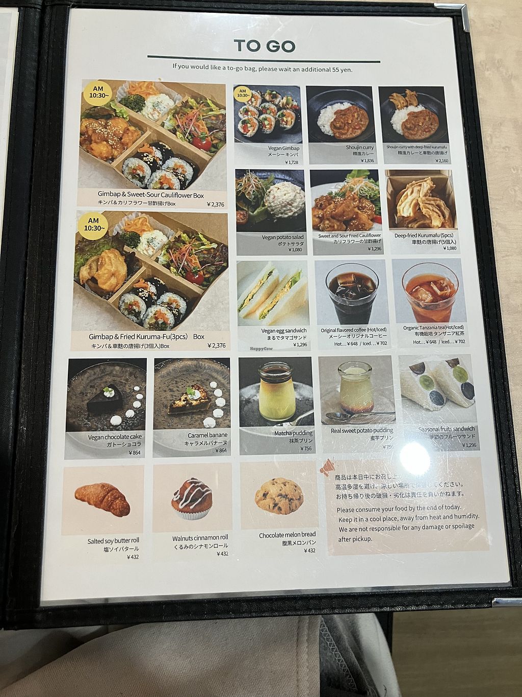 The food was out of this world. I’m from Denver Colorado in the US and we have great vegan options. This was better than most of them. I would eat here every week! We ordered egg salad sandwiches, miso soup, gimbap, chocolate cake and several to go items. Every item was tasty and fu of flavor.