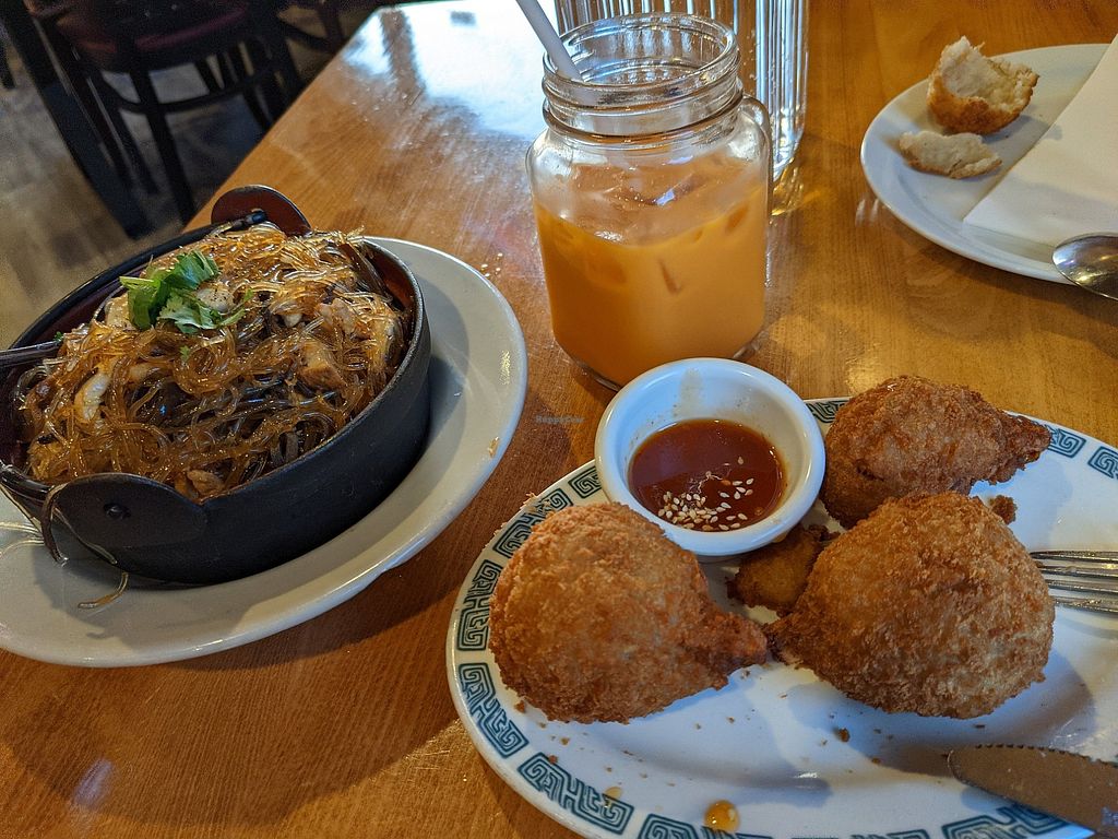 Clay pot, vegan chicken drumsticks, and Thai tea