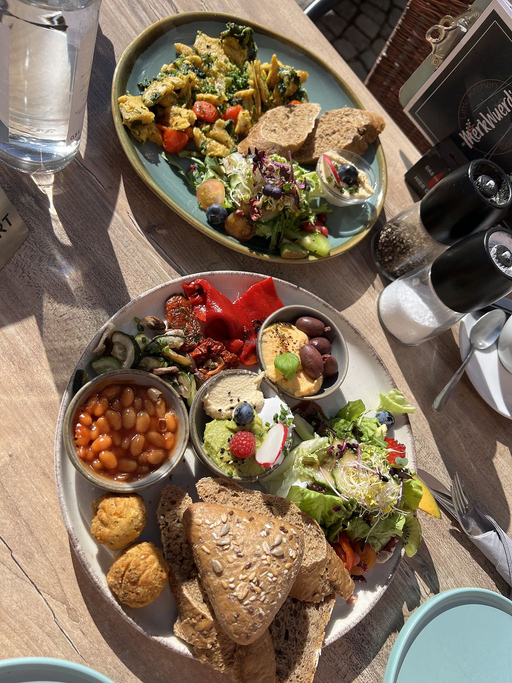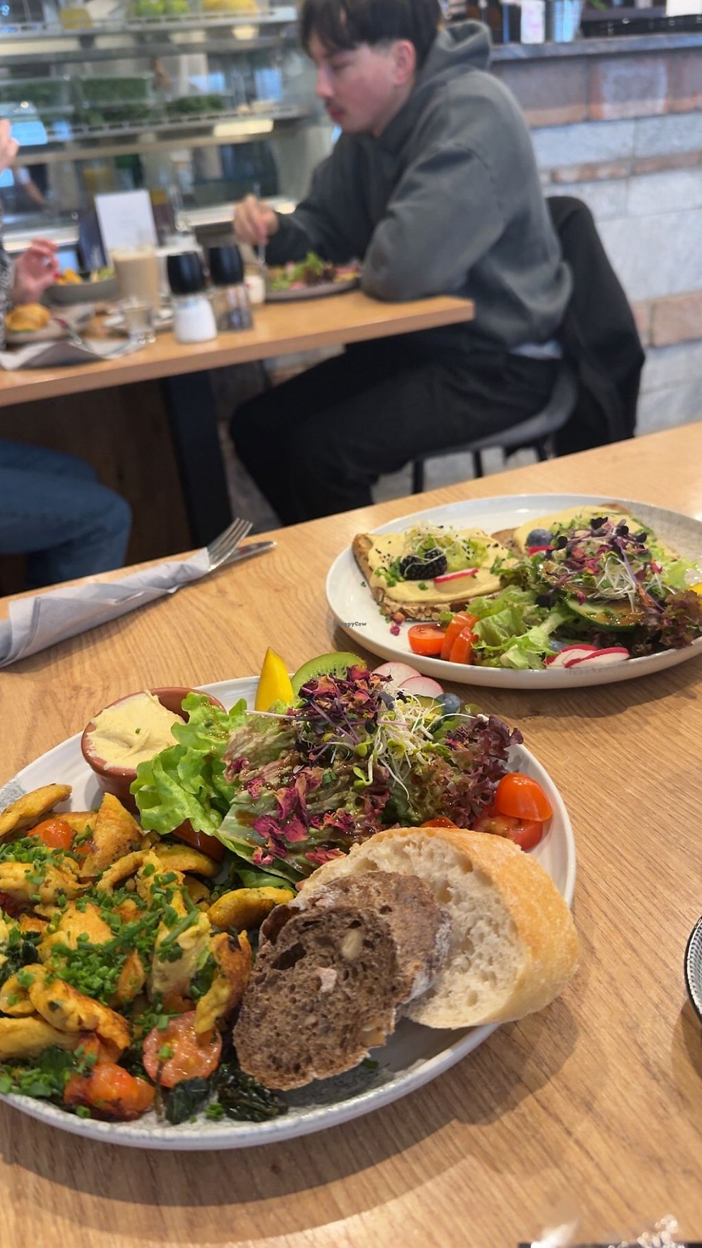Oben das vegane Rührei mit Spinat und Tomate und unten der vegane Land…