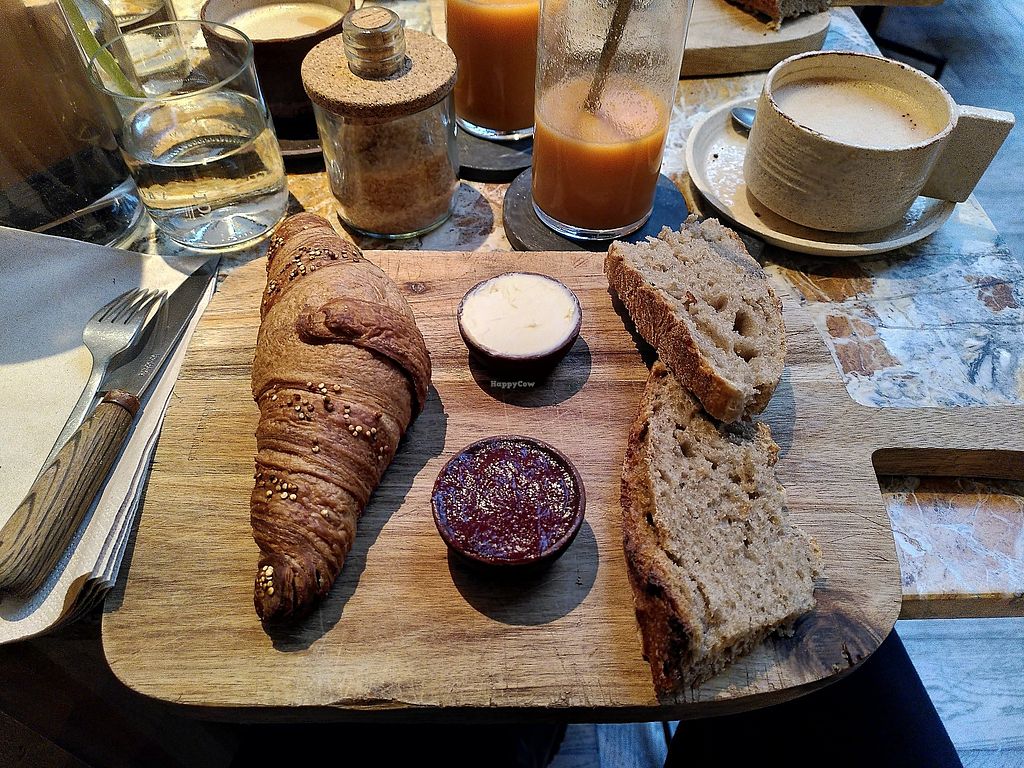 The menu offers entirely vegetable breakfasts, croissants, butter, hot chocolate!