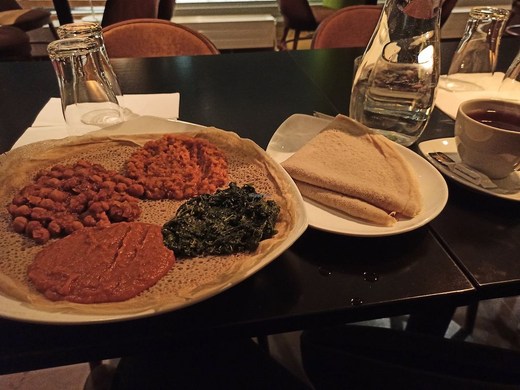 Nice restaurant with lots of vegetarian ( which are vegan) options. Improved by adding a soy meat option. Would definitely recommend the mixed platter option where you can choose 4 of the vegetarian options. Classical Injera and can choose to eat with your hands or cutlery.