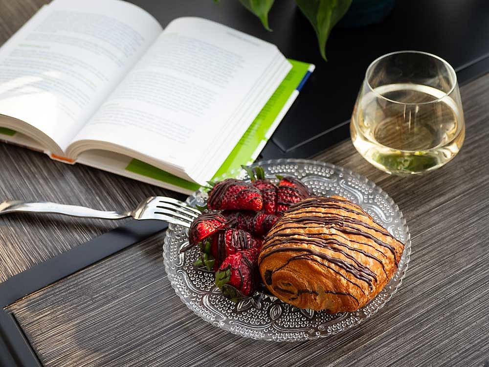 Dark chocolate is nestled inside our flaky vegan croissant and accente…