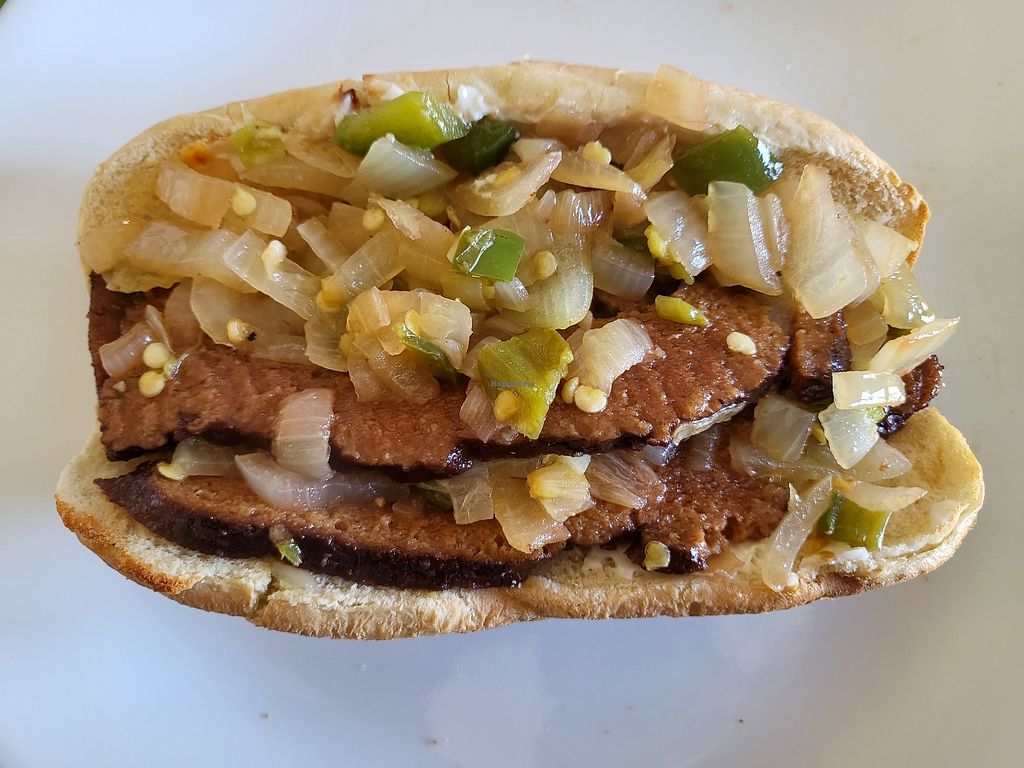 Our hot beef-like seitan sandwich with sauteed onions and peppers