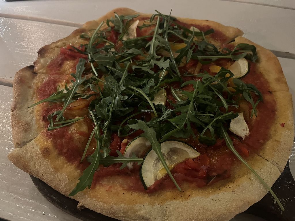 Read moreThere were several clearly marked vegan pizzas and pasta ( two of each) plus salads and bruschetta. I opted for the vegetariana less the cheese which was delicious! They also said that their pizza dough is vegan ( always enquire as one pizzeria I was going to try out told me their dough is not vegan!). The pizza was freshly prepared and the crust was crispy and chewy. Perfect! Variety of olive oils on the table.