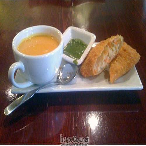 I arrived at Mi Lah Vegetarian a little before 1 p.m. just as their lunch rush was about to stop. I waited at the front of the restaurant to be seated for about five minutes before picking up a menu to look over their lunch specials. The first floor is small with tables and three seats at the bar looking into the kitchen. There is also upstairs seating where the bathrooms are located. Mi Lah is BYOB and everything on the menu is vegan. Finally, one of the servers came over and sat me at a dirty table that hadn't been cleaned off yet from the patron before me. I was excited to eat here because their lunch special was $10 for soup, appetizer and entrée. I had a choice between 2 soups, 4 appetizers, and 5 entrées. It took another ten minutes for the server to come back and take my order and I was quickly losing the amount of time that I had before going back to work. I knew I was going to have to eat quickly. My soup and appetizer came out quickly and was served on the same plate. It looked delicious, which was good because I was starving.